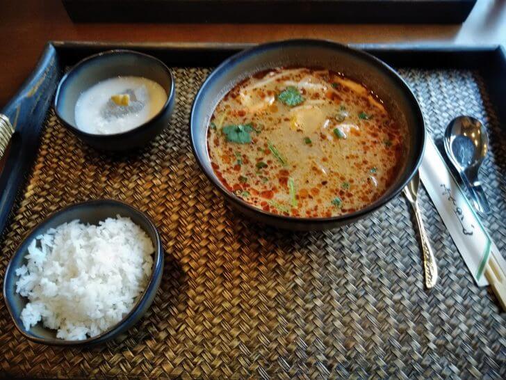今回はかみさんと2人で行きましたが、それぞれ別の物を注文することにしました。私は、海老入りトムヤムスープのタイラーメン、豚肉又は鶏肉のバジル炒めご飯を注文しました。