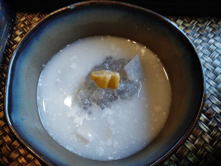トムヤムスープのタイラーメンは、海老、ネギ、タケノコ、もやし、香草などが入っており、辛味と酸味がちょうど良く美味しかったです。また、辛さは1~3で選択できるようです。今回は2を選択しました。麺はラーメンといってもフォーでした。 デザートは、ココナッツミルクにタピオカと芋とコーンを入れた物でした。味は普通でした。