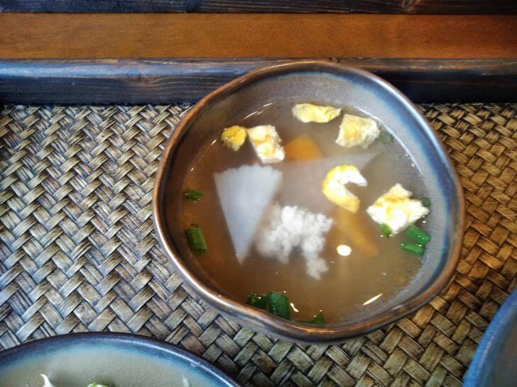 豚肉、鶏肉のバジル炒めは、タイ料理らしく美味しかったです。ただ、ご飯はタイ米なのでパサパサしてあまり美味しくないですね。サラダが付いてきますが、普通に美味しいです。スープは大根、人参、玉子などが入って、ナンプラーが入っていると思われるもので、あっさりしていながらコクがあり、美味しかったです。