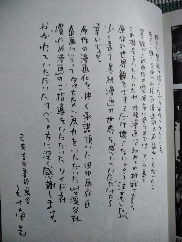 漫画にはあまりあとがきのようなものはないと思いますが、最終頁には五十嵐画伯直筆のあとがきが 書いてありました。そこには、このコミックを発刊するに当たってお世話になった方々への感謝の言葉が綴られていました。