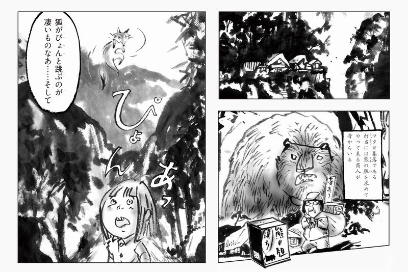 原作は未見であるが、マタギの里として知られる秋田県阿仁郡阿仁地方(現、北秋田市)で採話された山の怪談奇譚を、水墨画のようなタッチでコミカライズ化したもの。殺伐とした現代の都市伝説とは異なり、美女に化けた狐狸に化かされて、持参の大切な食物を奪われたり、見たこともない怪物と対峙するなど、昔ばなしでよく聞かされた様な牧歌的ともいえる怪談がマンガとなった事により際立つが、物語の時代背景となる昭和の頃は、古い時代の気風を持つ人々や自然への畏怖がまだ色濃く残っていたが故に体験し、見聞きした実話怪談なのであろうか…。