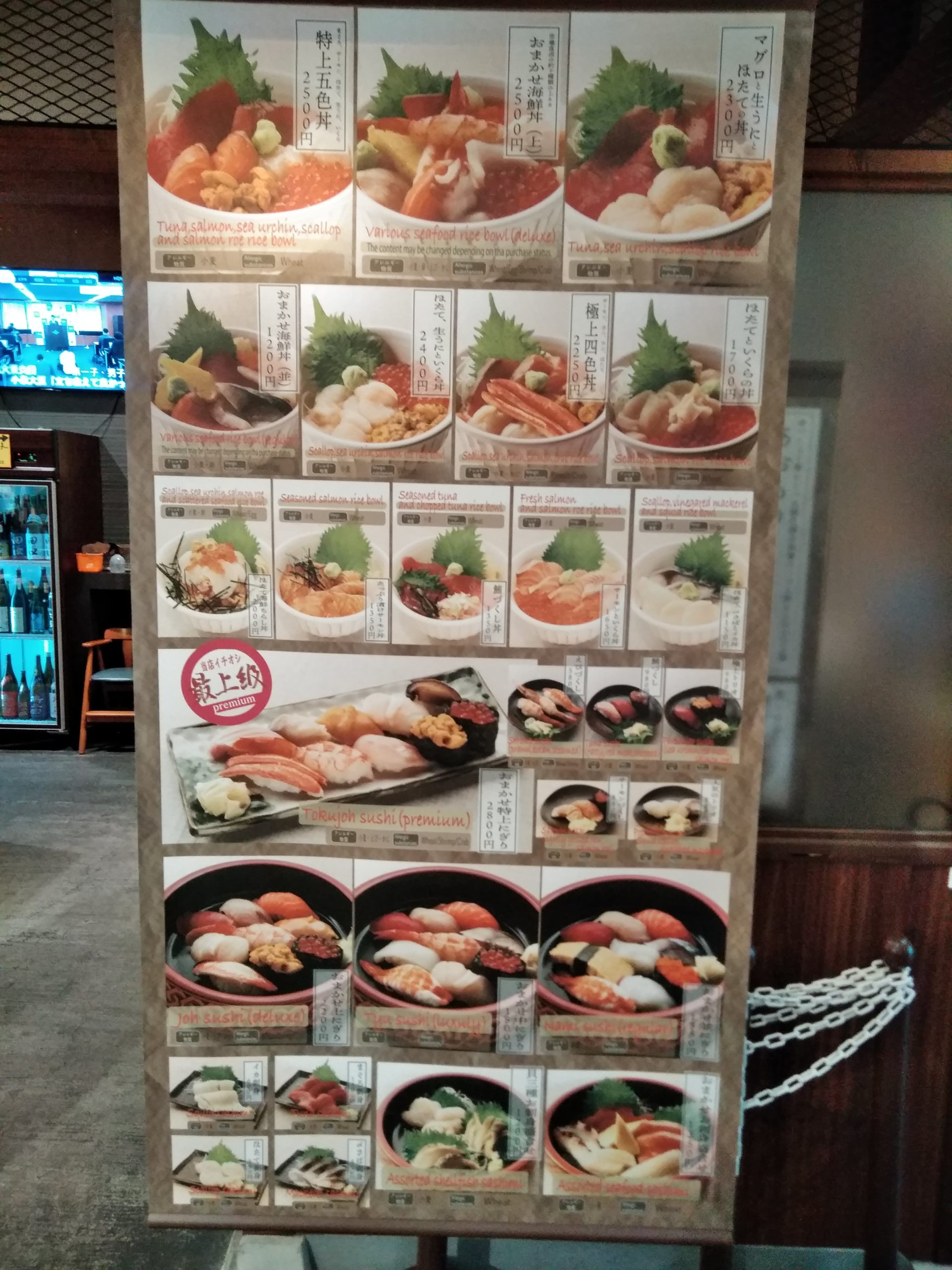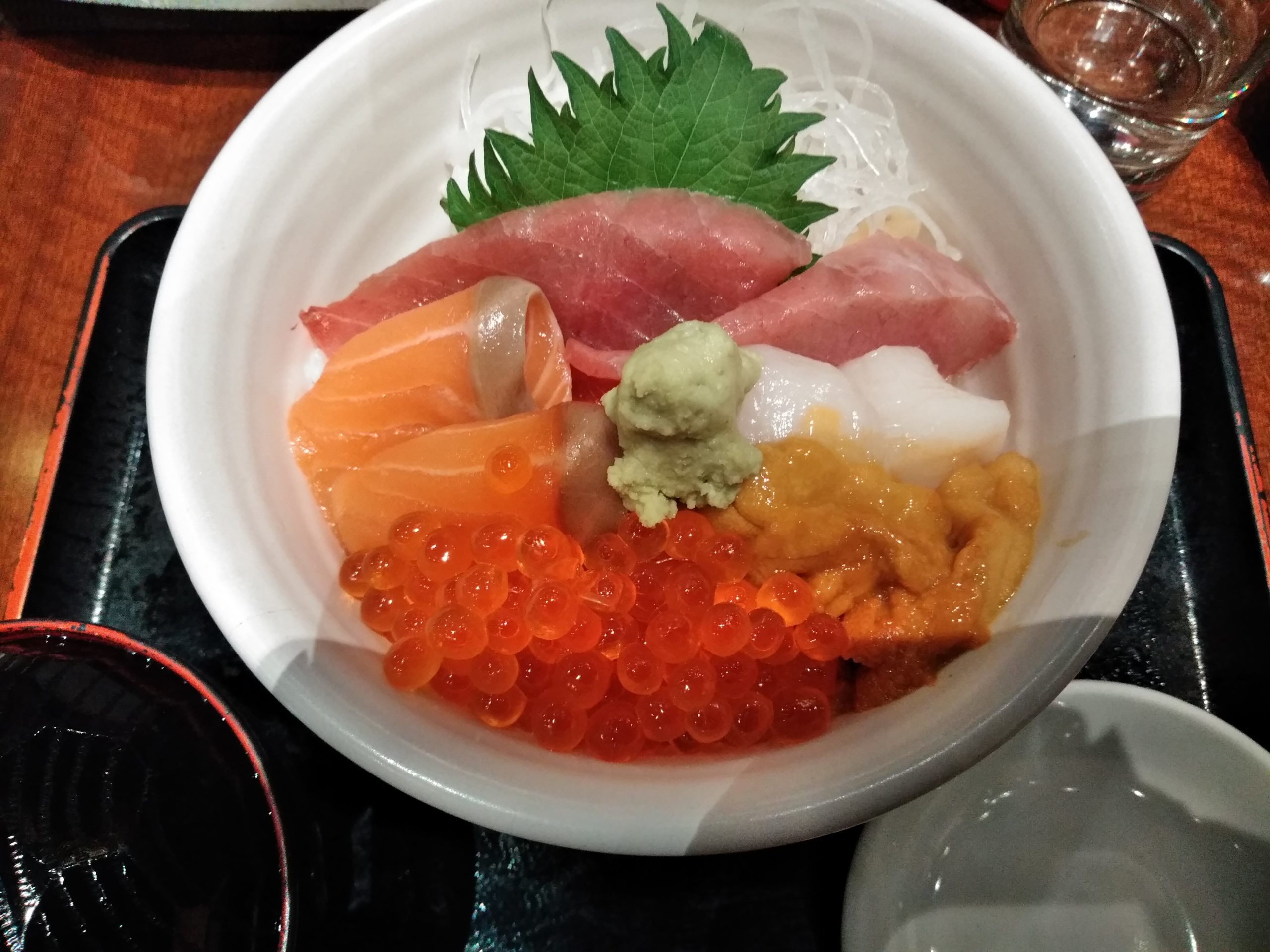 かみさんは特上5色丼(海鮮丼)2500円を注文。マグロ、サーモン、イカ、ウニ、イクラが載っていました。どのネタも新鮮で美味しかったですね。