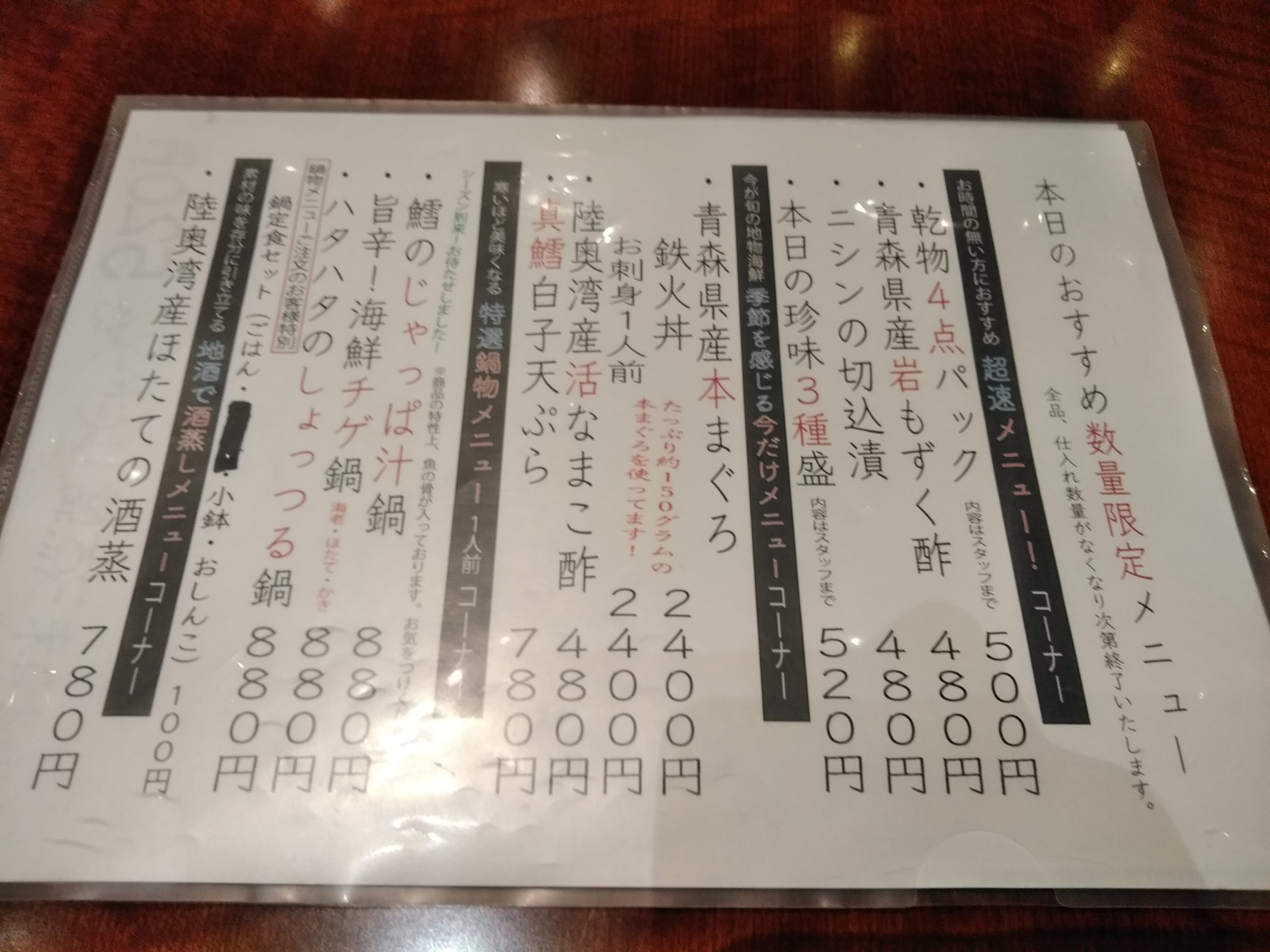 本日のおすすめ数量限定メニューもありました。「魚っ喰いの田」といえば、海鮮丼ですね。美味しそうな海鮮丼メニューがたくさんありますね。