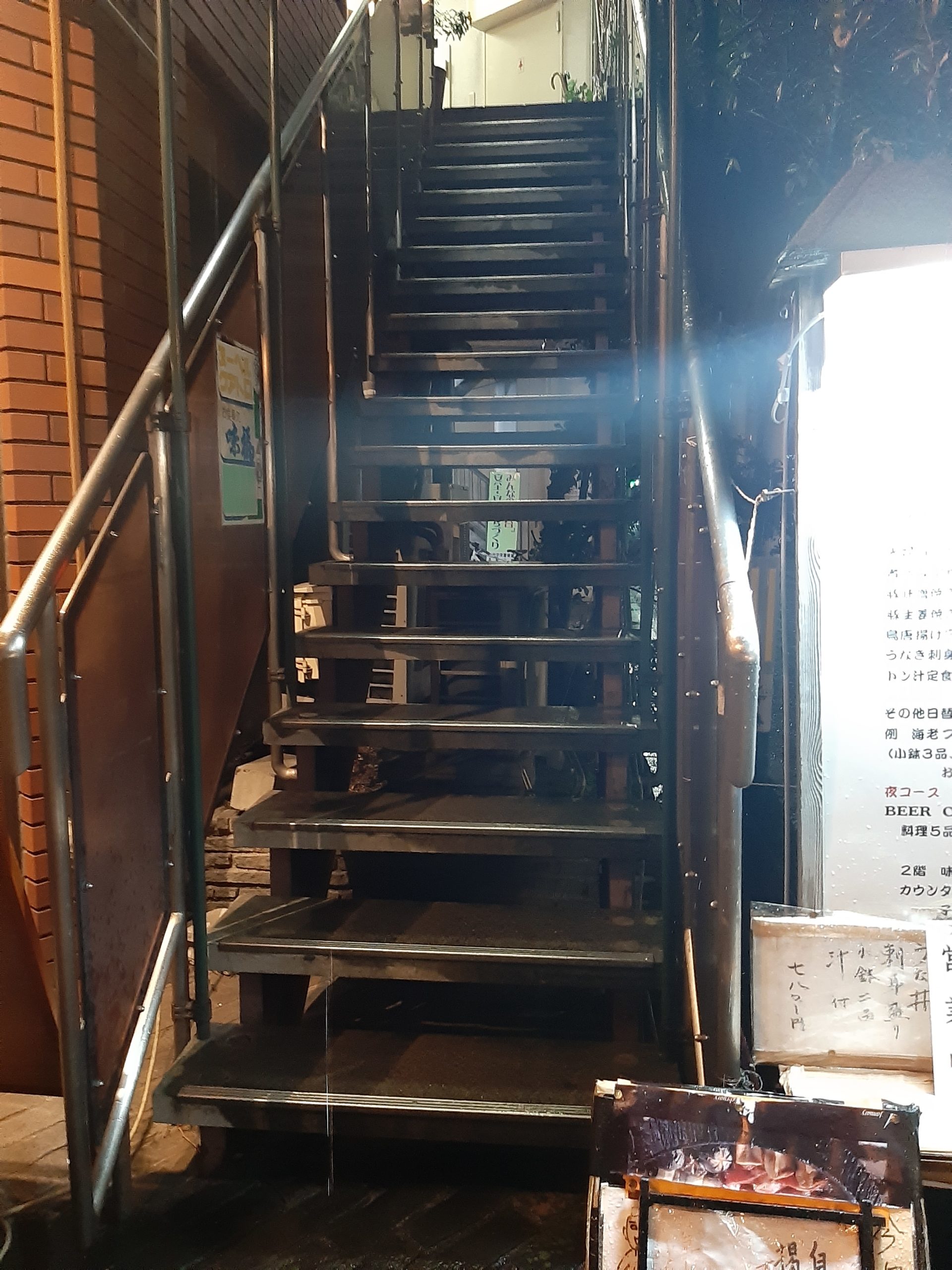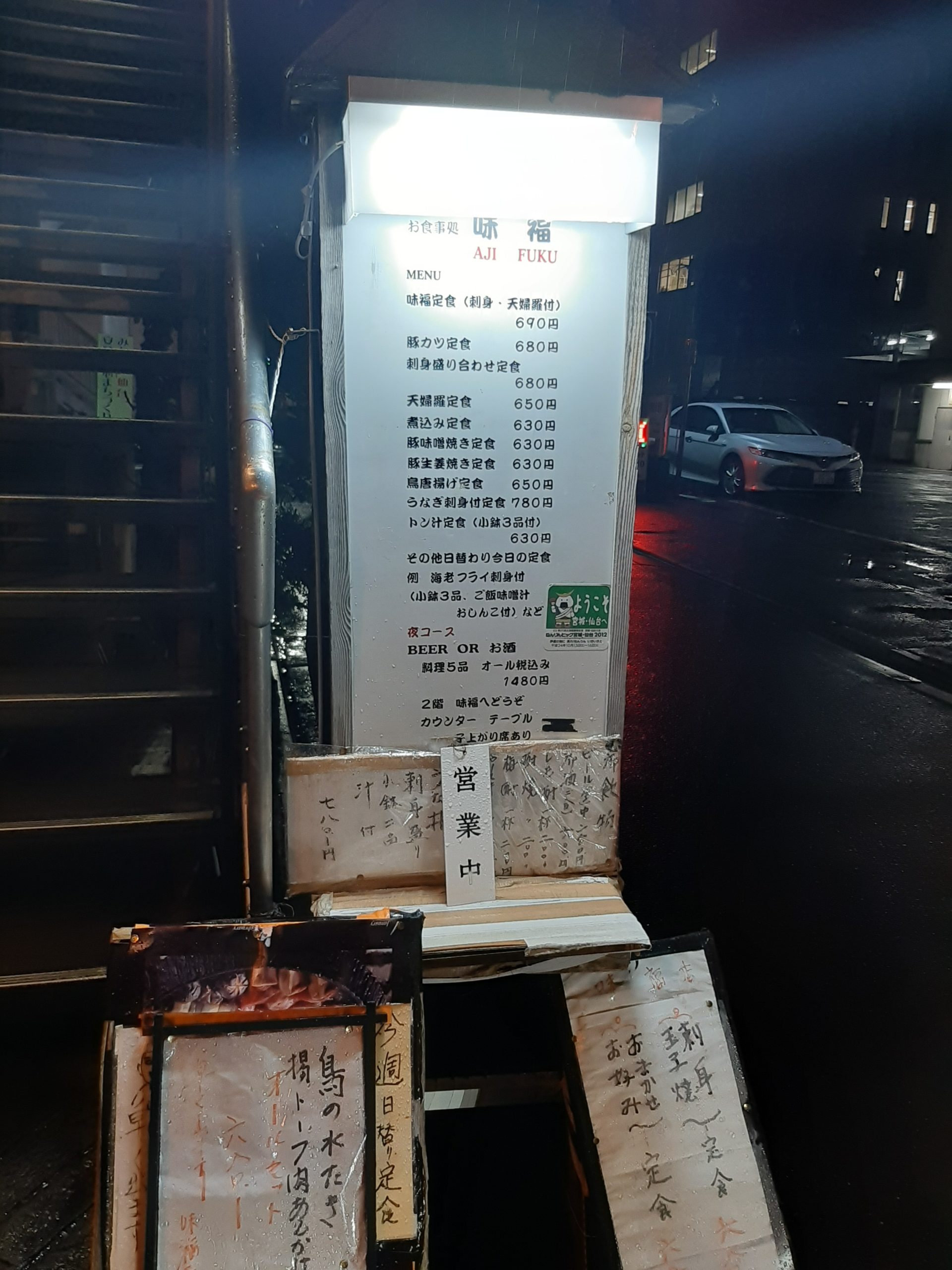 エンドービルの2Fに味福はあります。階段の登り口にメニュー看板と営業中の表示があります。
