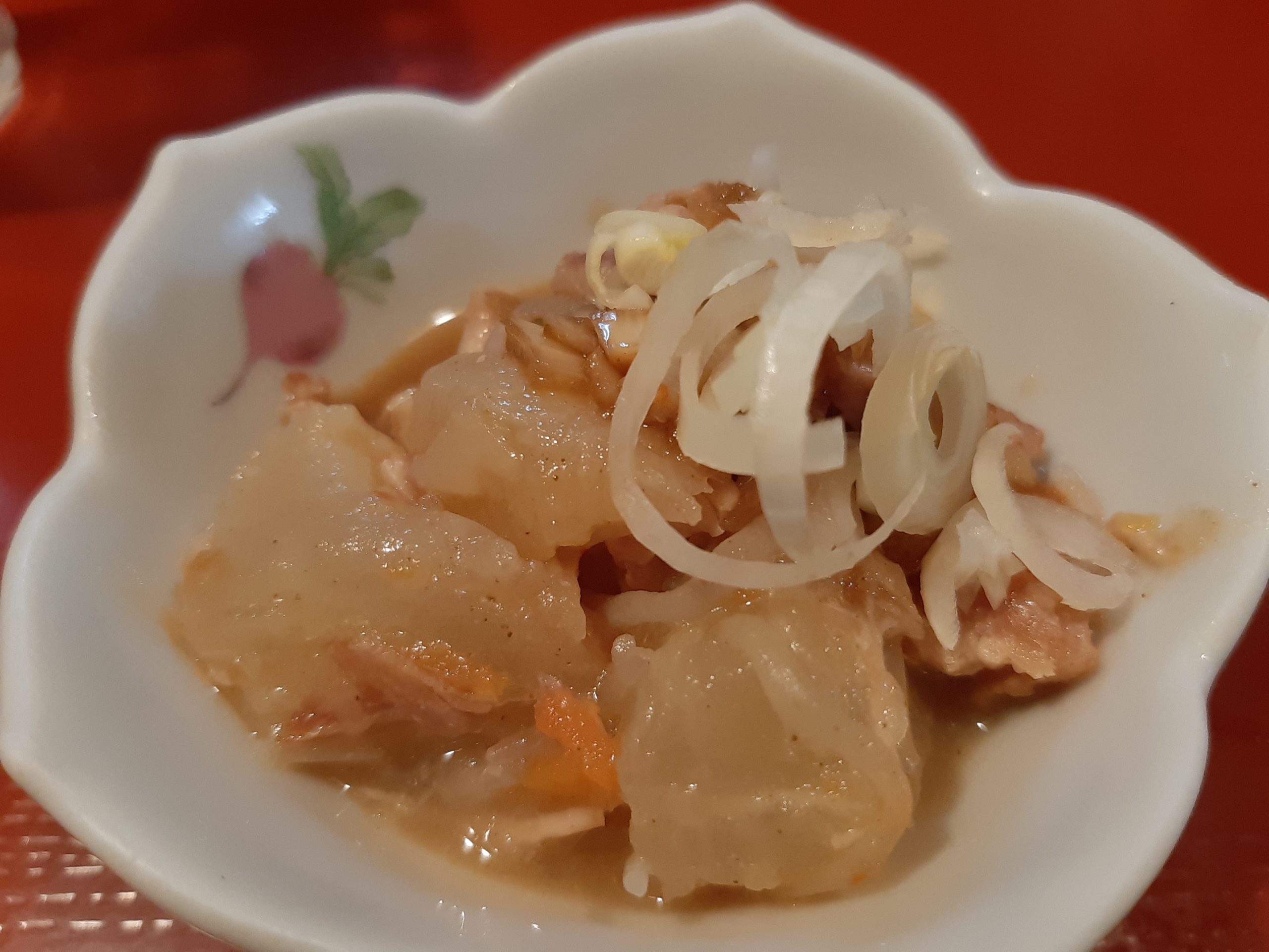 料理の一品目は、大根と豚肉の煮物。後載せのネギがアクセントになって美味しいですね。