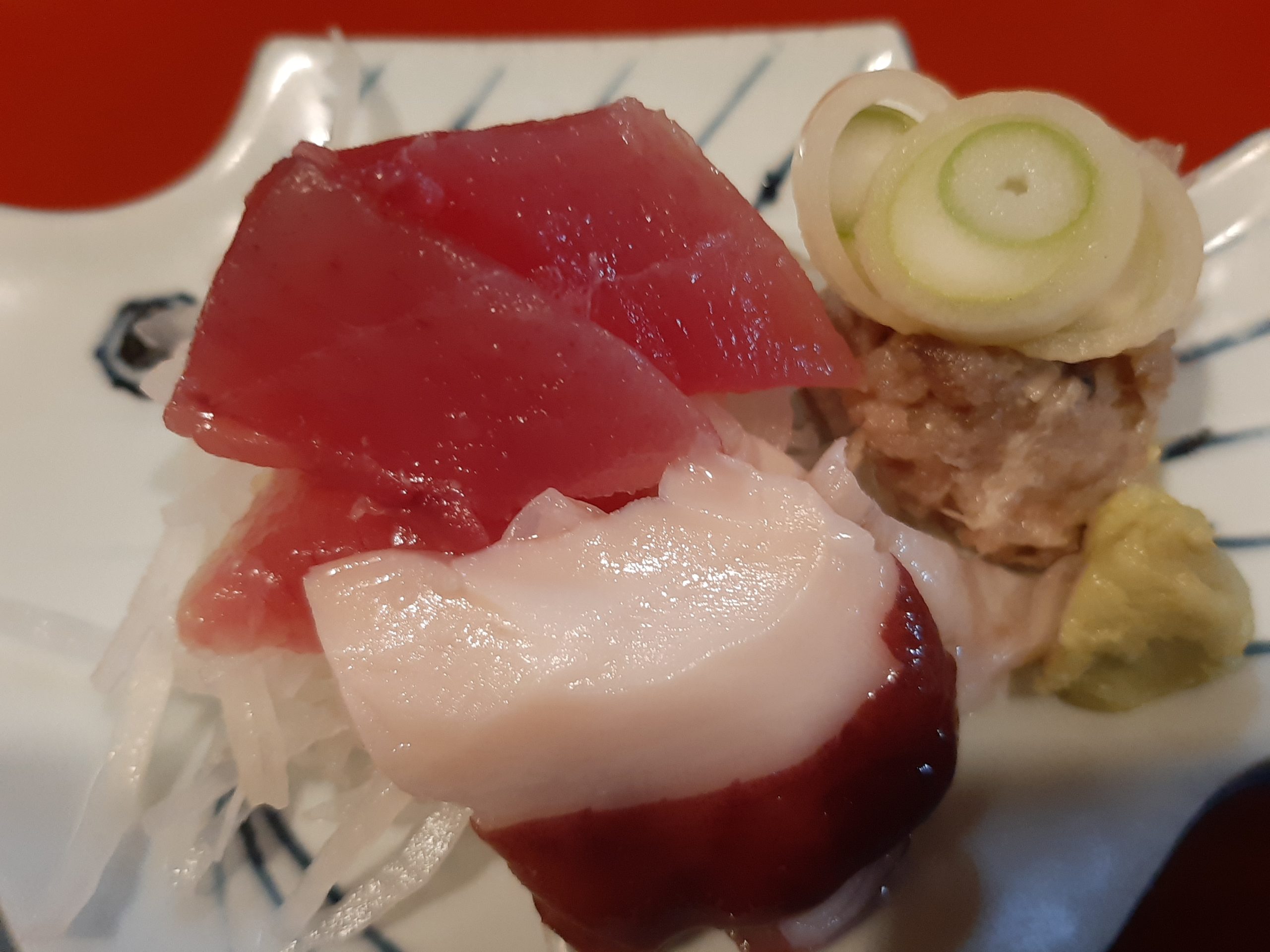 刺身は、マグロとタコとアジのたたきと3種盛です。新鮮で美味しいです。この店の良いところは、昔から刺身のつまは玉ねぎである点です。