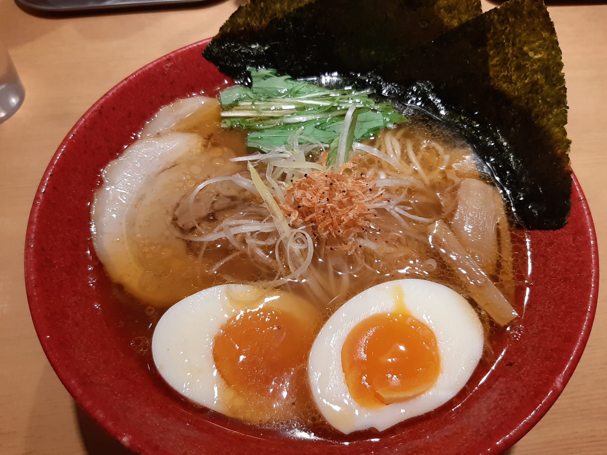 今回は初訪だったので、迷いましたが、あっさり醤油仕立ての元祖 特製海老そばを注文しました。特製海老そばの具材は、普通の海老そばの具材(水菜、白髪ねぎ、メンマ、アミエビ、海苔1枚、炙りチャーシュー1枚)の他に煮卵、チャーシュー1枚増、海苔2枚増となっています。後から食べログの口コミ等を見ていたら、海老を強く感じるのは濃厚醤油仕立ての海老そばガツンのようです。