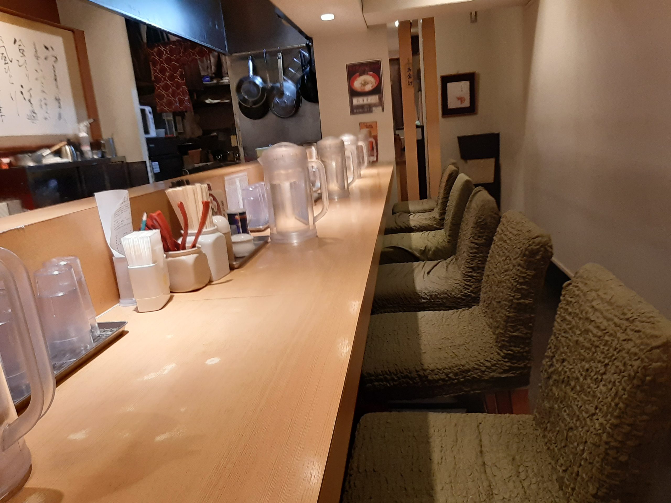 カウンターは8席ですね。この日は18:30に訪問しましたが、私が入店時にはお客さんが2名、退店時に2名来ました。夜の時間がまだ早いせいか、空いていました。