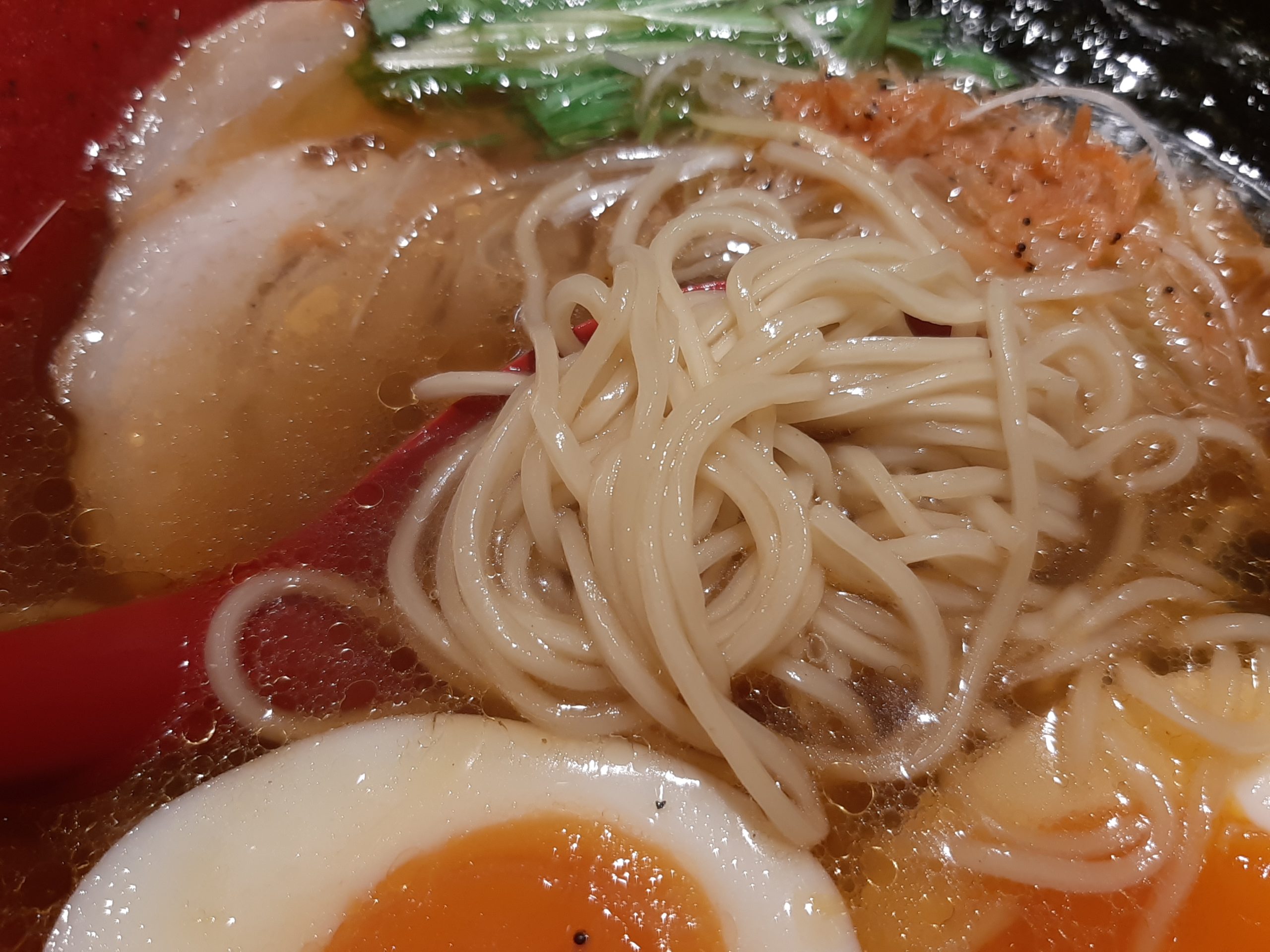 麺は細麺で、ツルツルシコシコしていてこのスープに合いますね。スープは海老の風味が、そんなには強くはないように思えました。また鶏系スープとのWスープのようなので、あっさりしているのに奥深いのかなと思えました。
