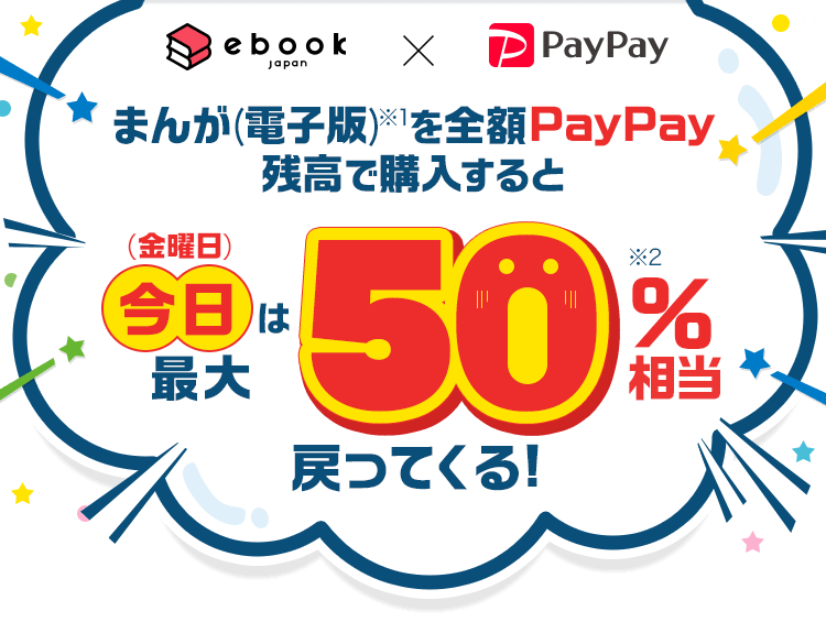 また「ebookjapan」では、毎週金曜日に、“ソフトバンク”あるいは“ワイモバイル”を利用中の方など、対象のお客さまが電子書籍を購入すると、最大30%が付与されるキャンペーンを実施しています。「ebookjapan 3月は毎日最大20%戻ってくる!」キャンペーンと組み合わせることで、期間中の金曜日(3月6日、3月13日、3月20日、3月27日)に対象のお客さまがPayPay残高で支払うと、購入額の最大50%が付与されます。