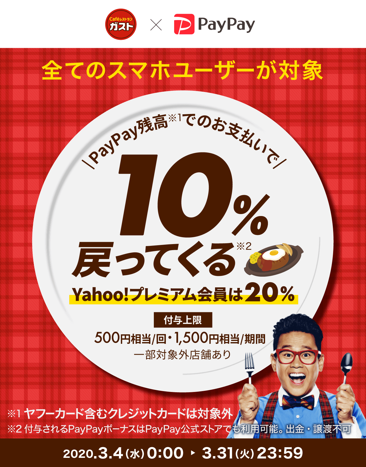 すべてのPayPayユーザーを対象に、ガストでも「ガストで美味しいおトクなキャンペーン」を展開する。PayPay残高払いで支払うと通常は10%、ソフトバンク/ワイモバイルのスマホユーザーと「Yahoo!プレミアム会員」は20%還元が受けられるキャンペーンだ。付与上限は500円相当/回、1500円相当/期間。また、PayPayに登録したクレジットカードによる支払いは対象外となる為、注意が必要。