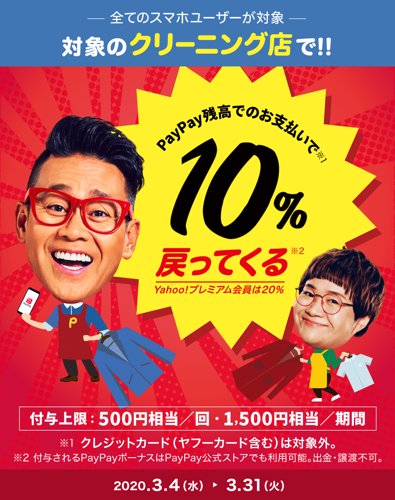 「春のクリーニングおトク祭り」では、対象のクリーニング店での会計時に「PayPay支払い」を利用すると10%戻ってくる。また、ソフトバンク/ワイモバイルのスマホユーザーと「Yahoo!プレミアム会員」は還元率が高く、20%に設定されている。付与上限はいずれの場合も500円相当/回、1500円相当/期間。ポイント還元事業の5%対象店舗なら最大25%還元です。