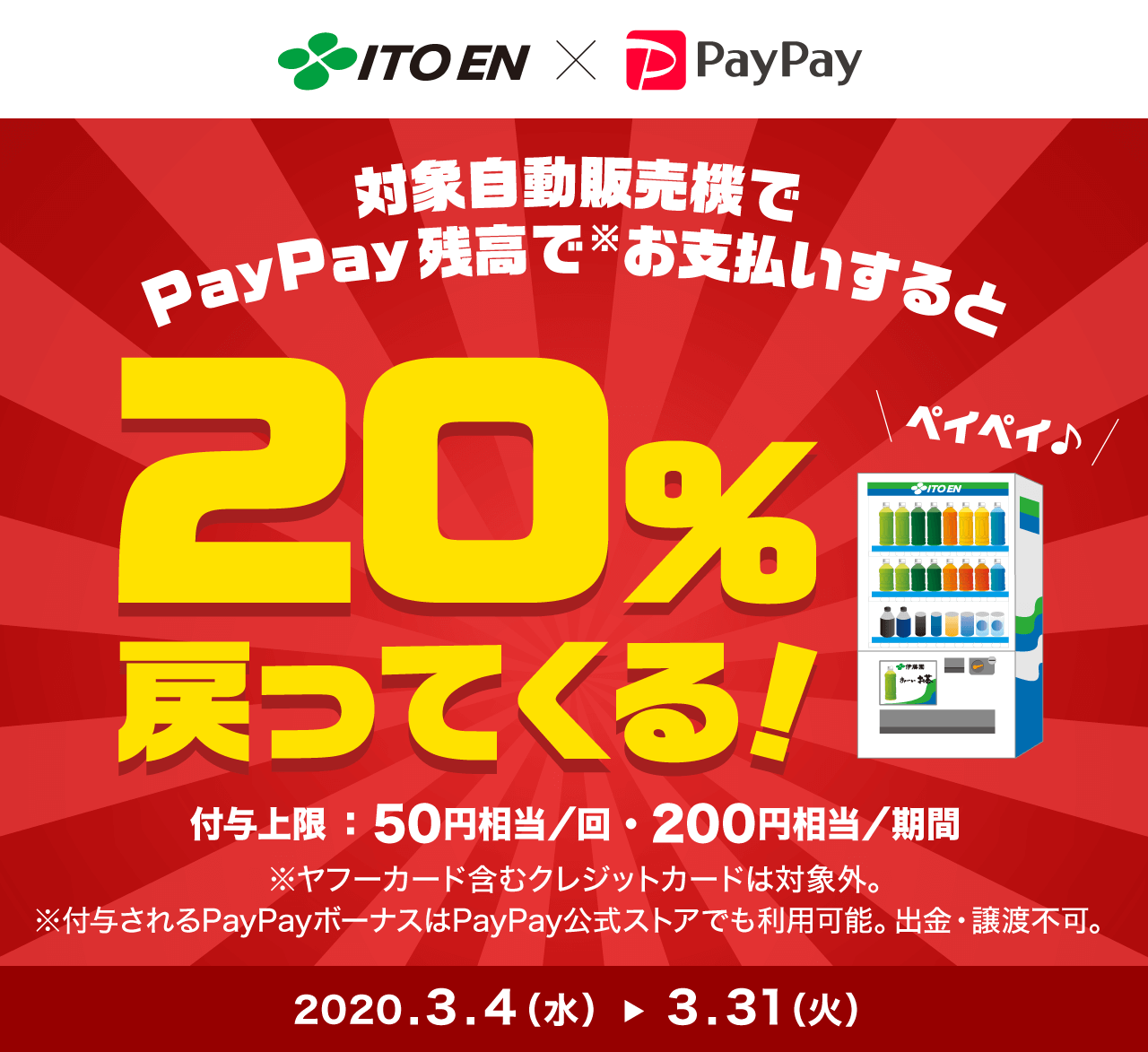 | 伊藤園の対象自販機で最大20%戻ってくるキャンペーン | 2020.3.4~3.31 | 公式ページ |