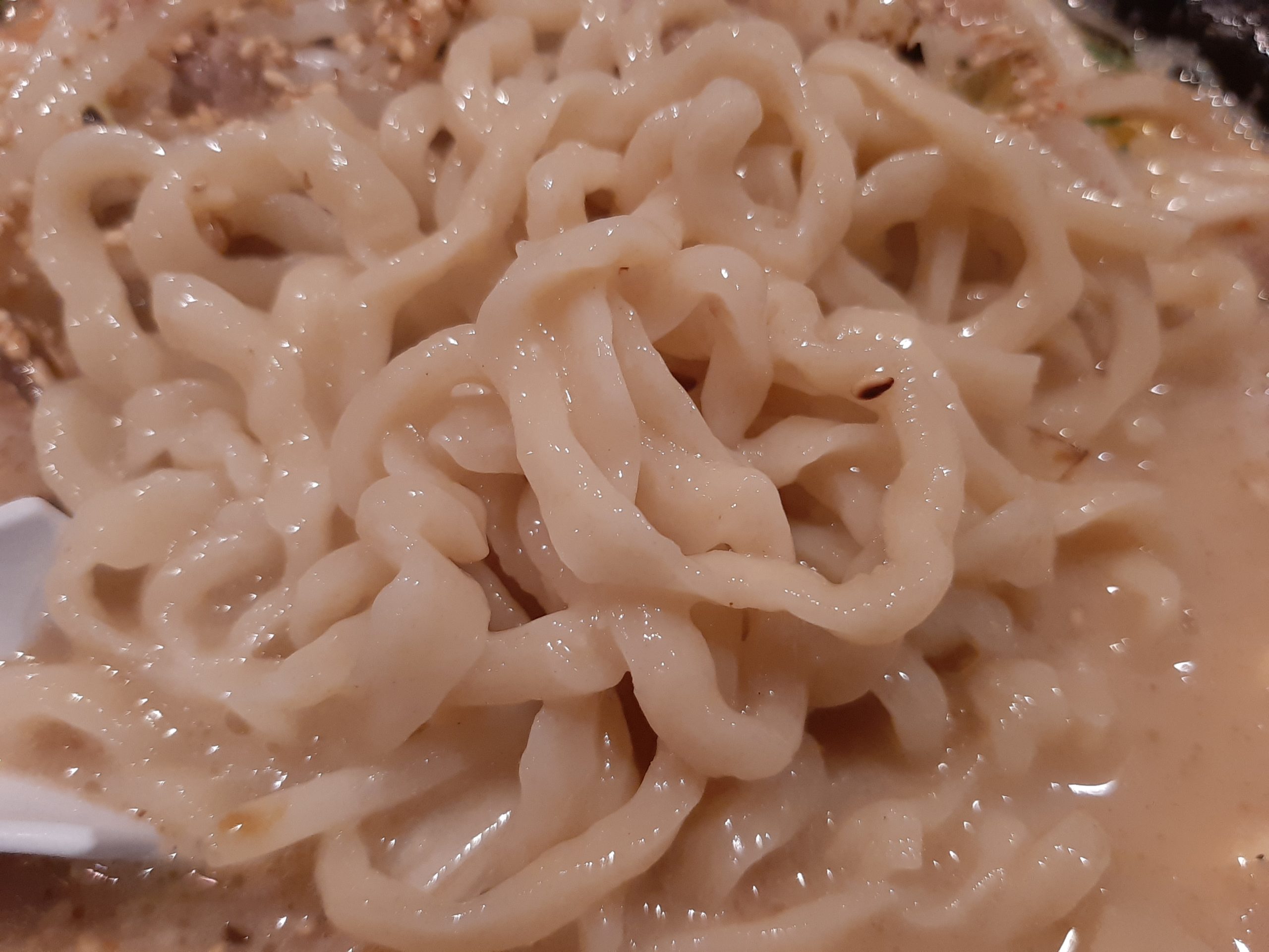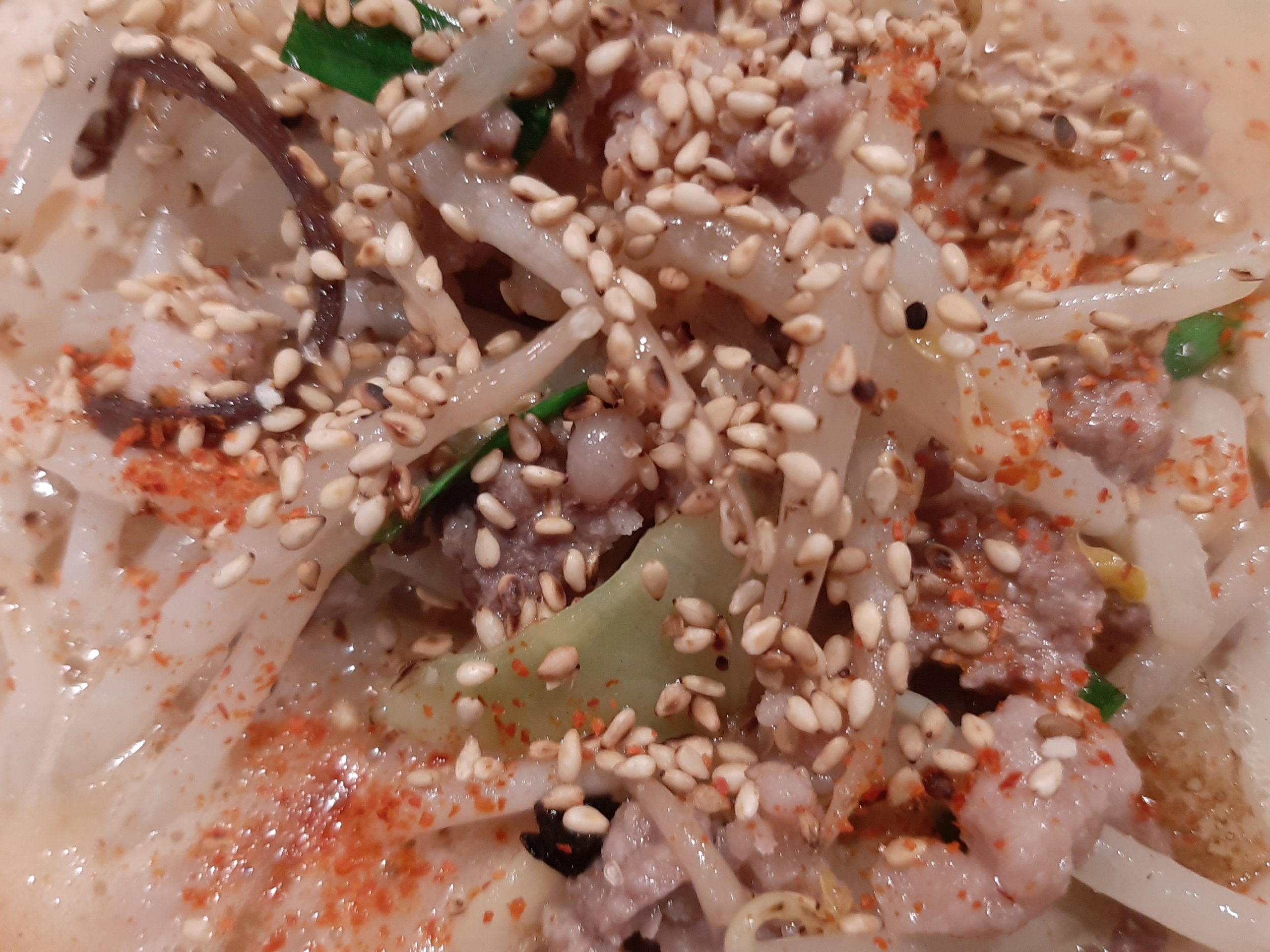 仙台で一番美味しい味噌ラーメンと宣伝していますが、どんな味なんだろうと思いました。スープはとんこつみそと思われる、とろみが強いスープで、甘味がありにんにくが効いていました。これは好みが分かれるところですが、私は好きな味ですね。具材はごま、もやし、玉ねぎ、ニラ、キャベツ、きくらげ、人参、豚ひき肉とボリュームがあります。