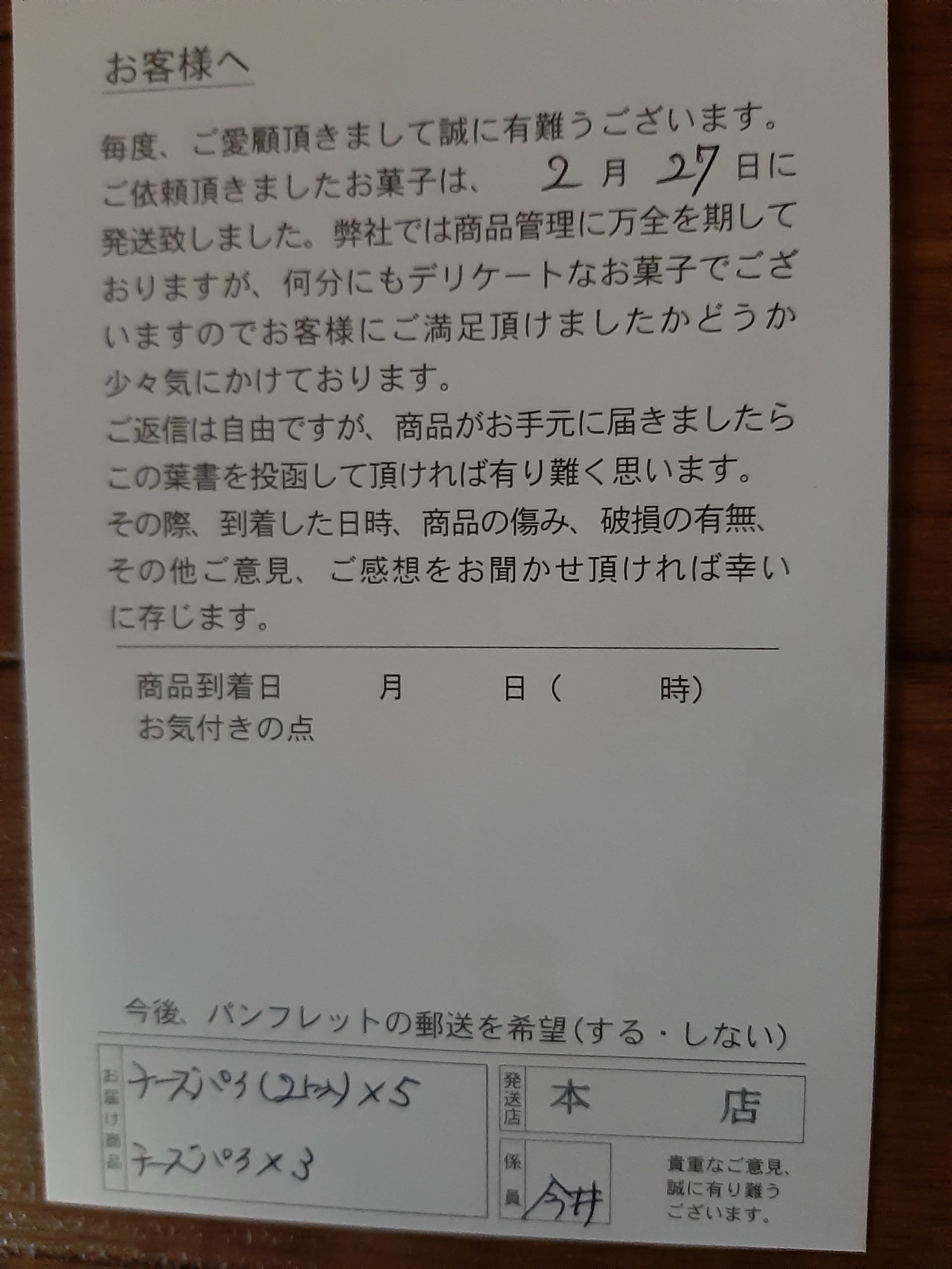 また、驚いたのは、商品が到着したか、商品のいたみや破損がなかったかを確認するハガキが同封されていたことです。