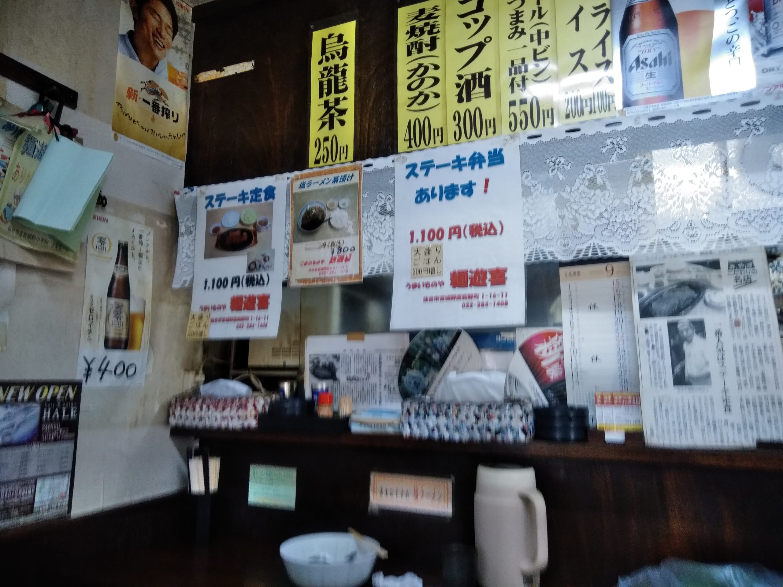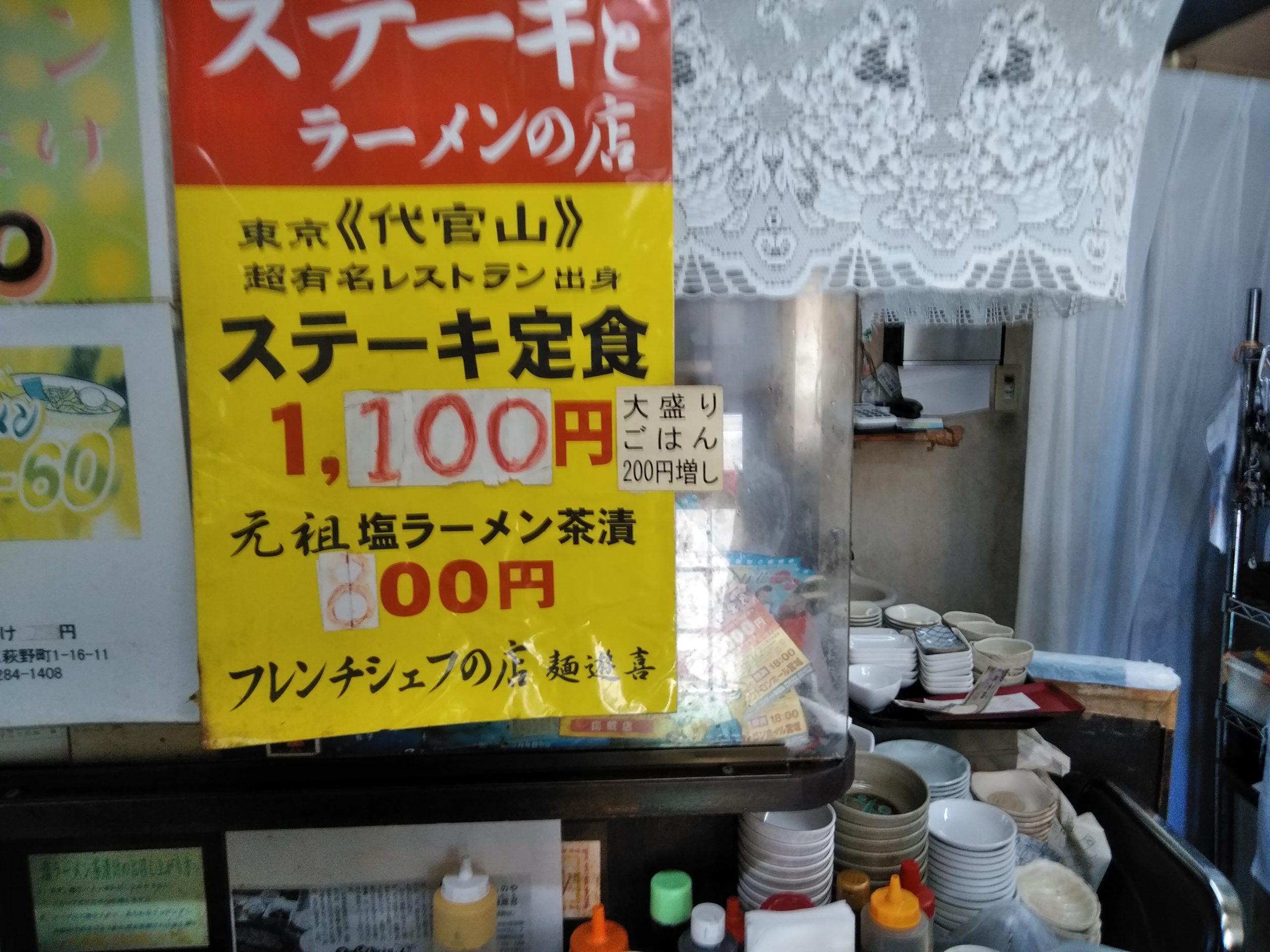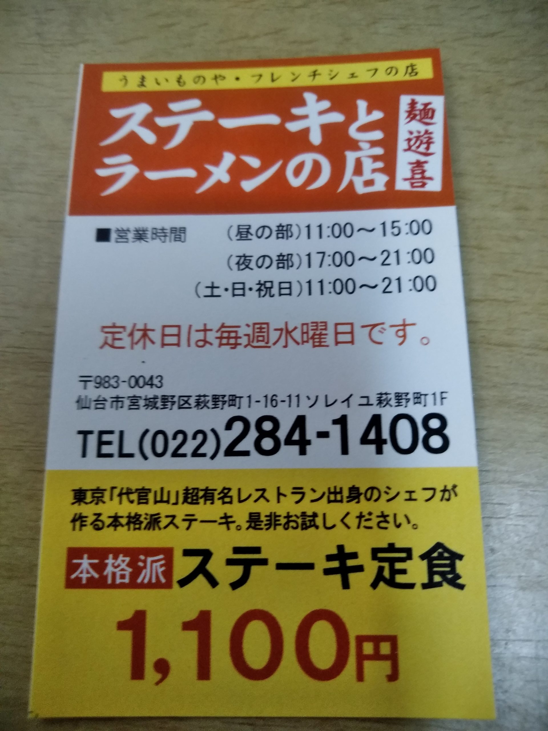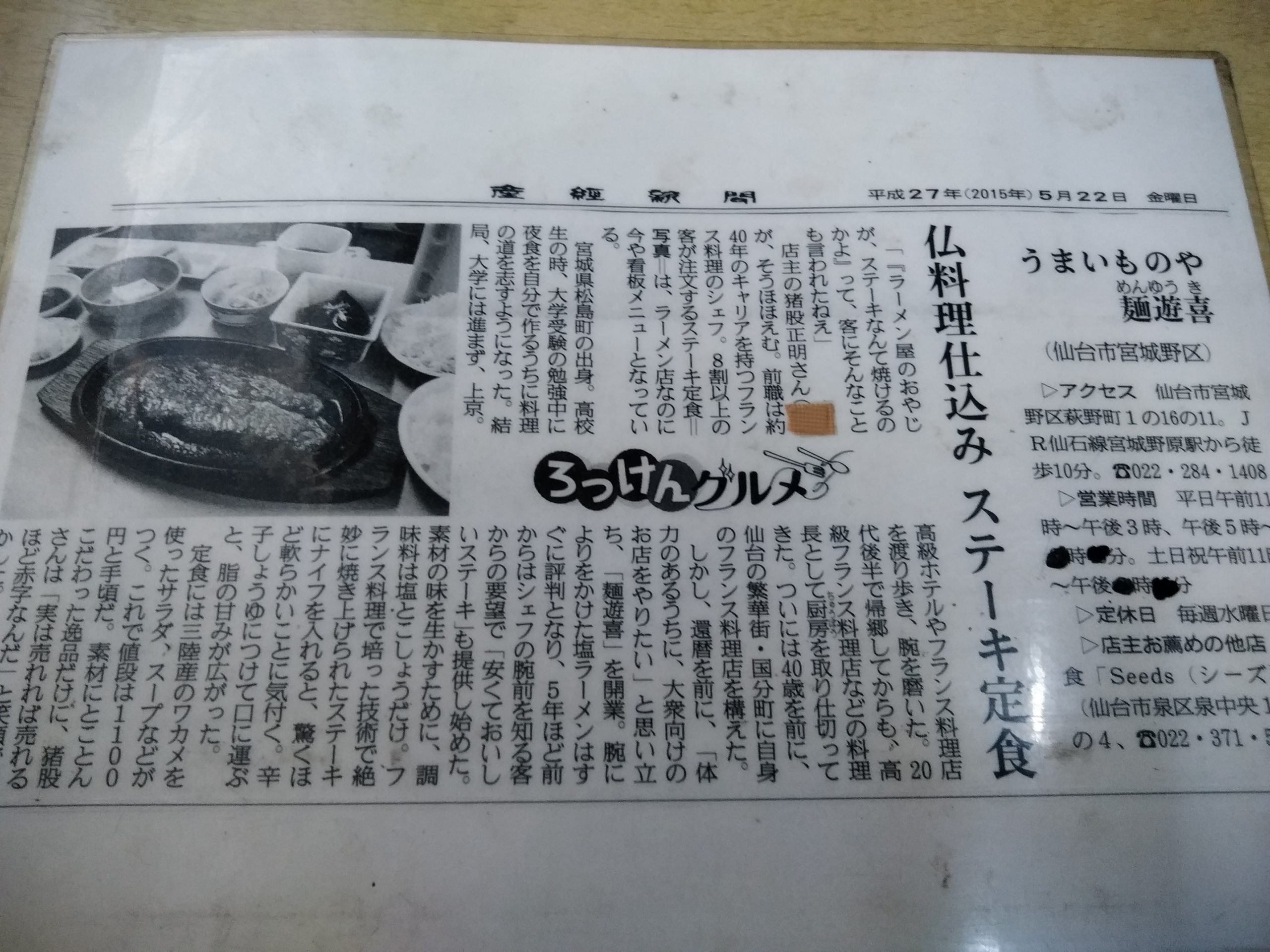 『うまいものや』は、ラーメン店なのですが、なぜかステーキ定食が有名で一番人気のお店なのです。店主はホテルや高級フランス料理店で修業して、40歳前には、地元の仙台市国分町でフランス料理店を開いていましたが還暦近くになって大衆向けのお店をやりたいと思い、麺游喜を開店したとのことです。なのでステーキなどの洋食には絶対的な自信を持っています。お店は当初、塩ラーメン茶漬けがメインのラーメン店だったのですが、お客様のリクエストで始めたステーキ定食が大人気となりました。 それからはステーキ定食やテイクアウトのステーキ弁当がメインのお店になりました。