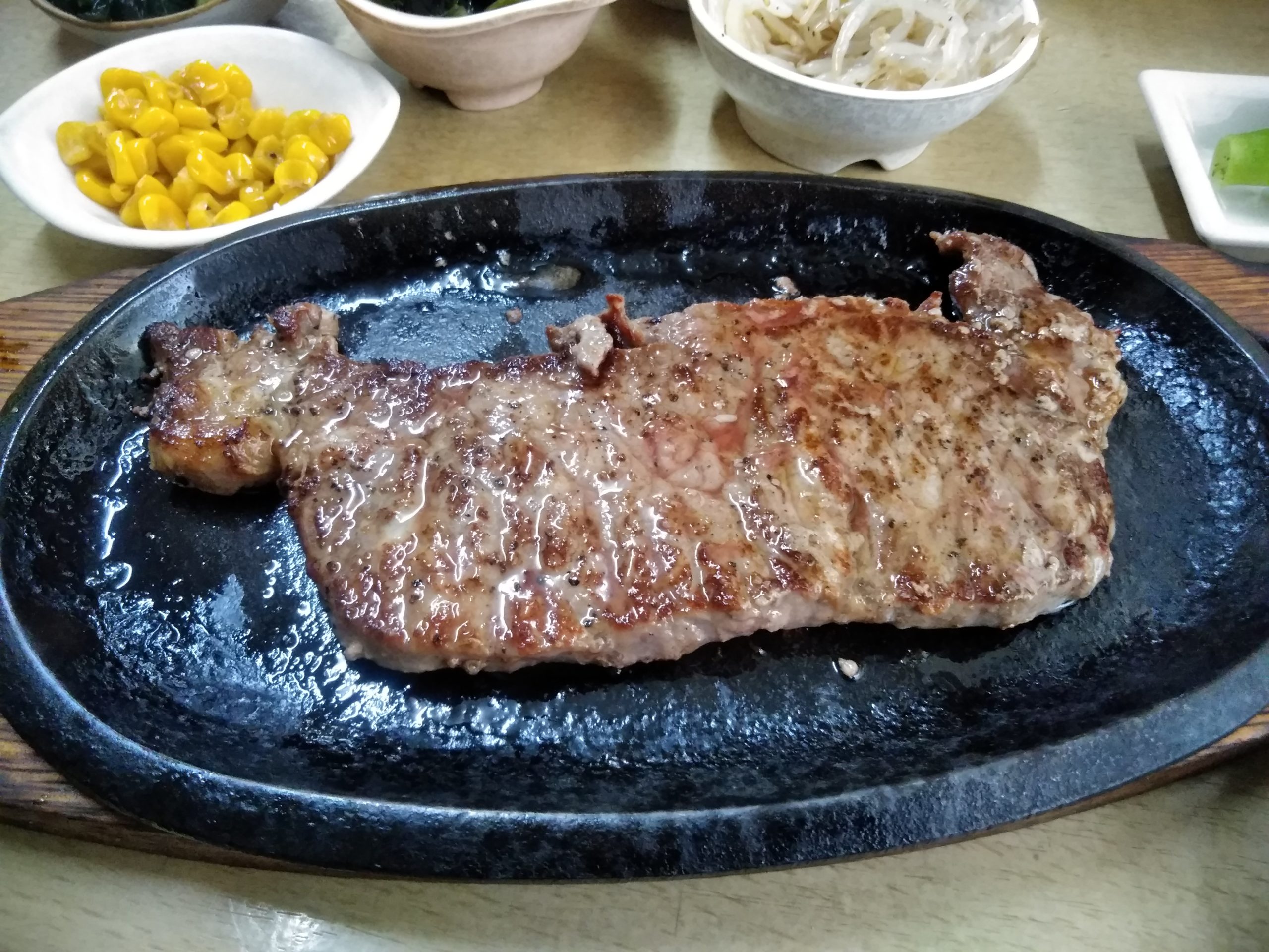 これが大人気のお店自慢のステーキです。美味しそうですよね。こんなサイズのステーキがこんな安い値段で食べれるなんてびっくりですね。