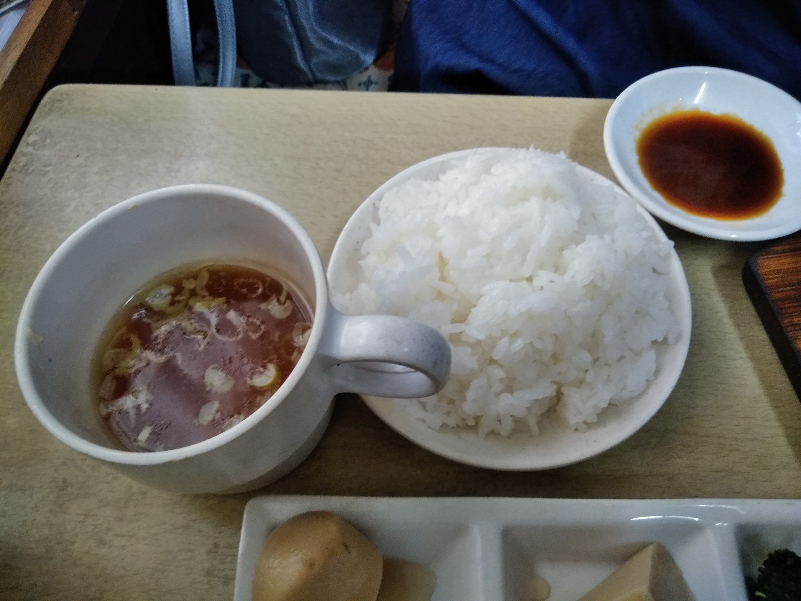 ご飯も大盛?で出てきました。これで普通盛のようです。更にご飯のお替りが必要だったら言って下さい。無料デサービスしますとのことでしたが、無理ですね。