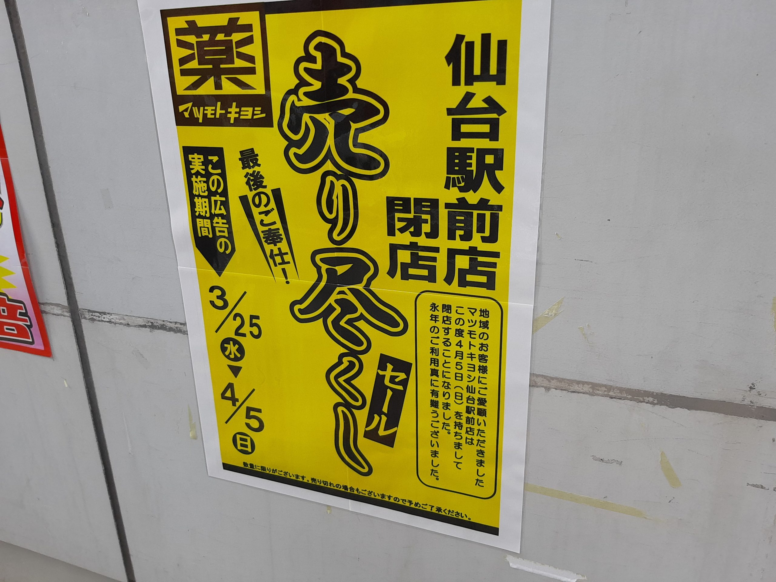 仙台駅前の一等地にあるマツモトキヨシ仙台駅前店が4/5閉店するみたいです。閉店セールを行っているようなのでリポートしたいと思います。