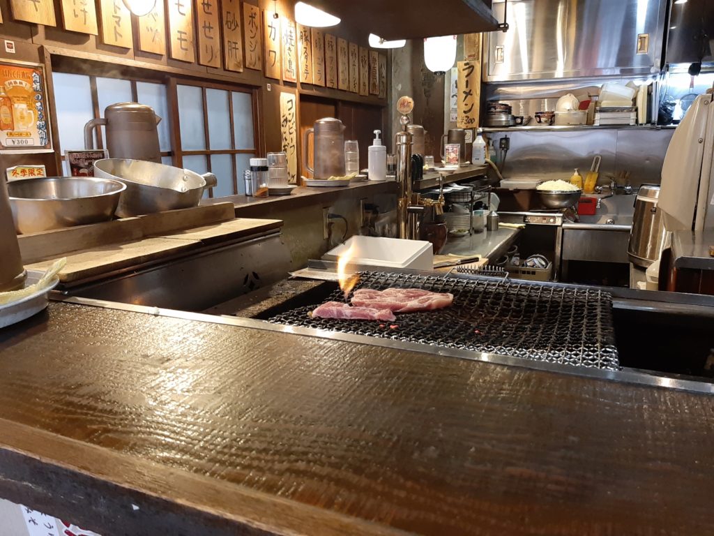 お店の焼き場で、分厚い豚肉を炭火で丁寧に焼いています。