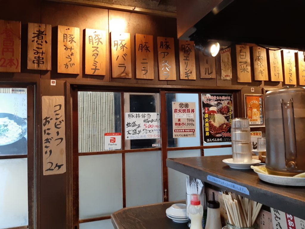 『ぼんてん酒場』は、夕方からほぼ全部のメニューが300円均一で提供される大人気でリーズナブルな立飲みの居酒屋です。しかし、ランチタイムにも炭焼き豚丼、炭火焼鳥丼、生姜焼定食やまぐろのなかおち丼などのランチメニューを提供していて、大人気で混雑するお店です。