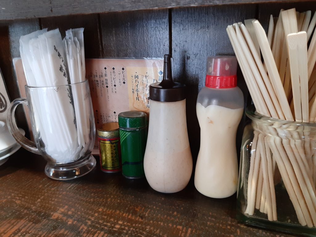 豚丼のキャベツ用ゴマドレッシングとマヨネーズ、他に山椒、唐辛子が、卓上調味料として設置されています。