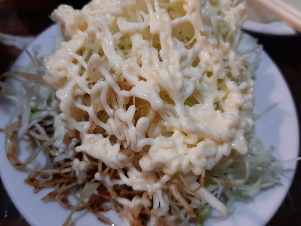 キャベツをお皿に退避して、マヨネーズをたっぷりかけます。現在はマヨネーズだけでなく、胡麻ドレッシングも置いてありました。進化していますね。