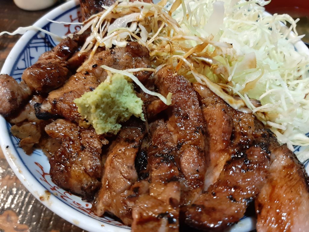 分厚い豚肉に甘辛いしょうゆのたれが良く絡んで美味しいですね。多めの山葵もアクセントになって良い感じです。マヨネーズをたっぷりかけたキャベツを食べながらだと更に美味しくいただけます。