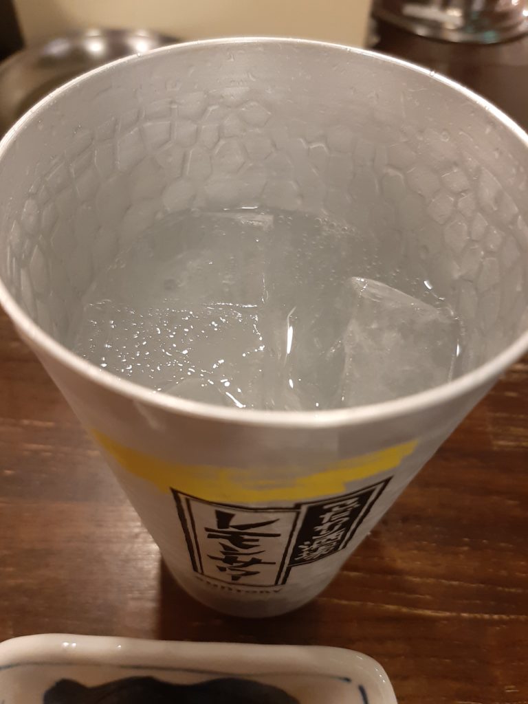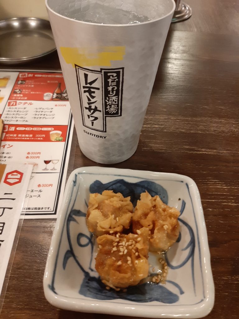 19時少し前に入店できたので、早速99円のレモンサワーを注文しました。レモンサワーの量はそんなに多くないですね。99円なので仕方ないですが。お通しは小さい揚げシュウマイ3個でした。会計時に分かったのですが、お通しは400円も取られました。