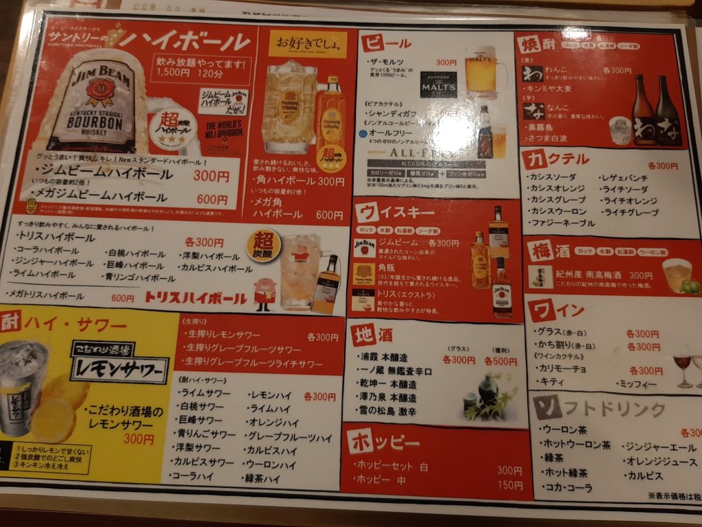 生ビール、ハイボール、酎ハイ・サワー、焼酎、カクテル、グラスワインが全て300円とリーズナブルな価格ですね。更にハイボールを中心にビールや焼酎も、飲める120分飲み放題1500円(税抜)もやっているようです。