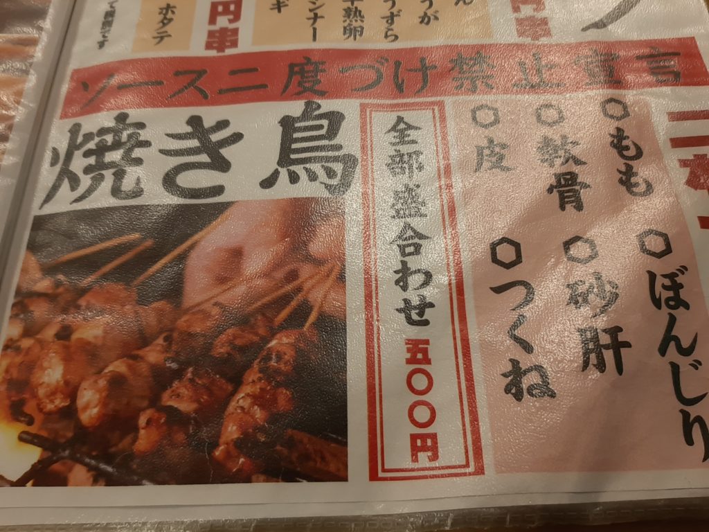 50円串揚げの種類は5種類(玉ねぎ、出汁巻き卵、餃子、極太メンマ、なす)もあります。