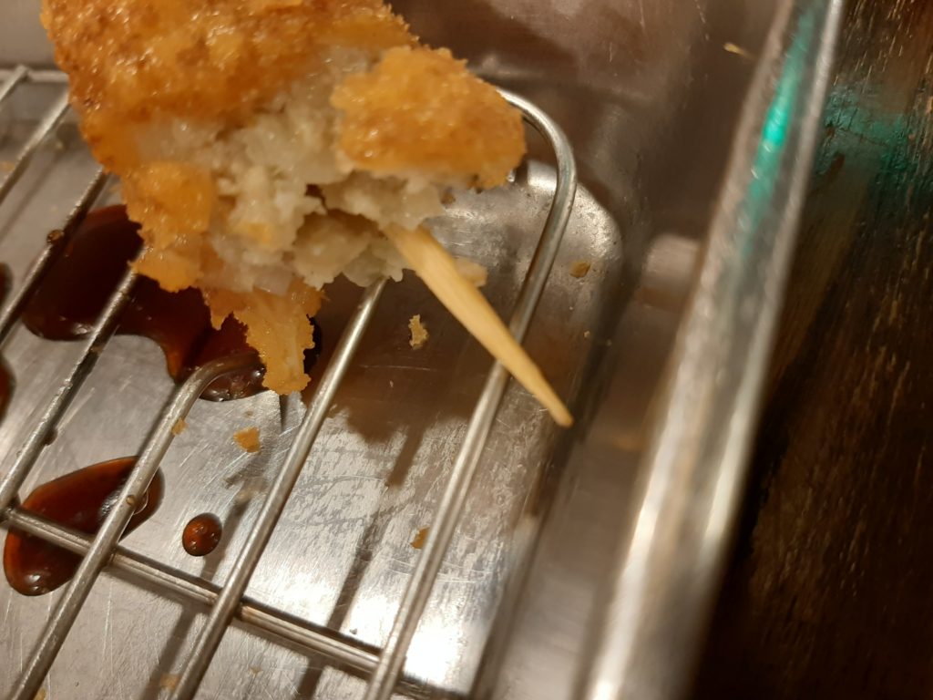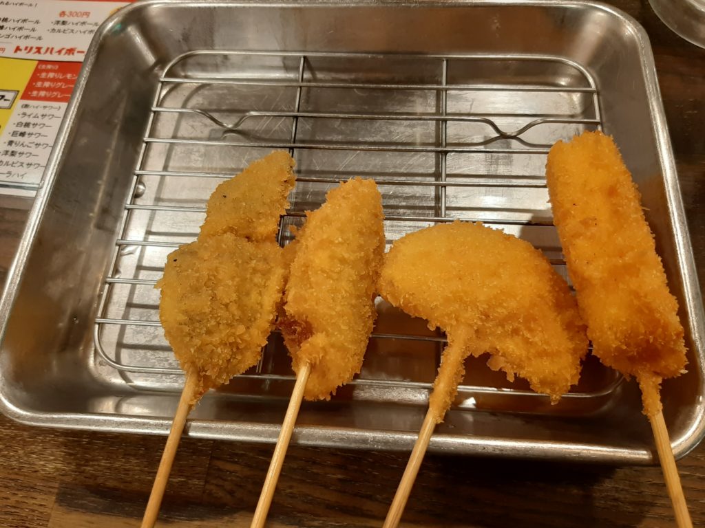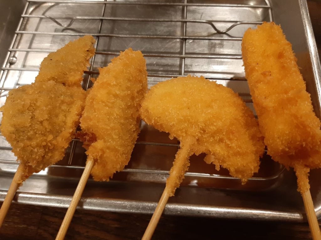 最後に頼んだのが、激安の串揚げです。オール50円のメニューの玉ねぎ、出汁巻き卵、餃子、なすの4本を注文しました。