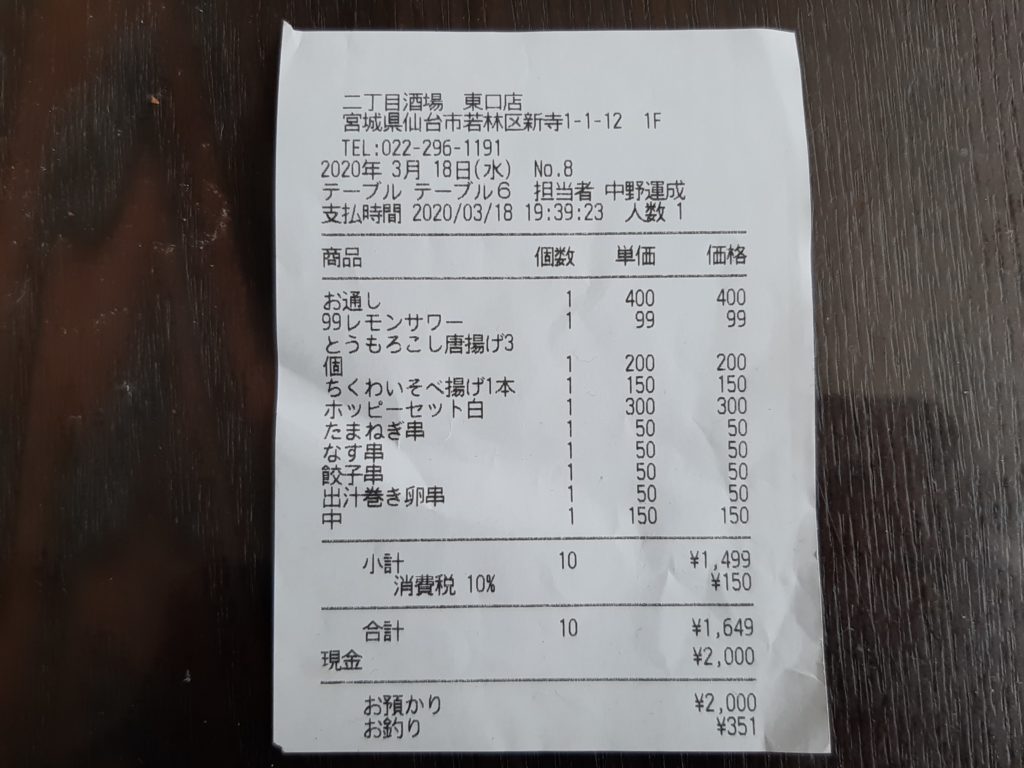 お会計です。トータルは1649円でした。お通し(400円)が一番高いので、これがもう少し安くなれば良いのですが。