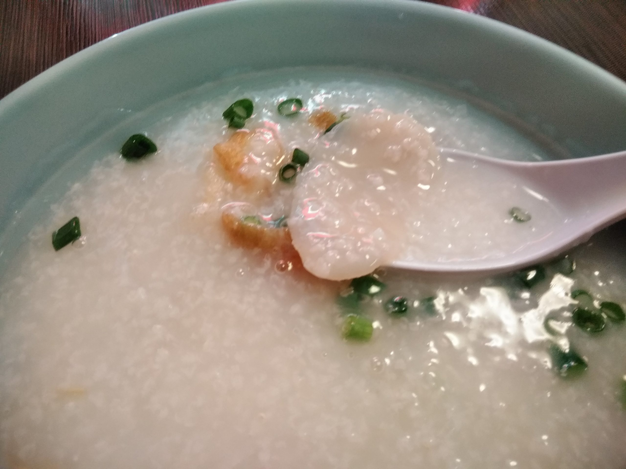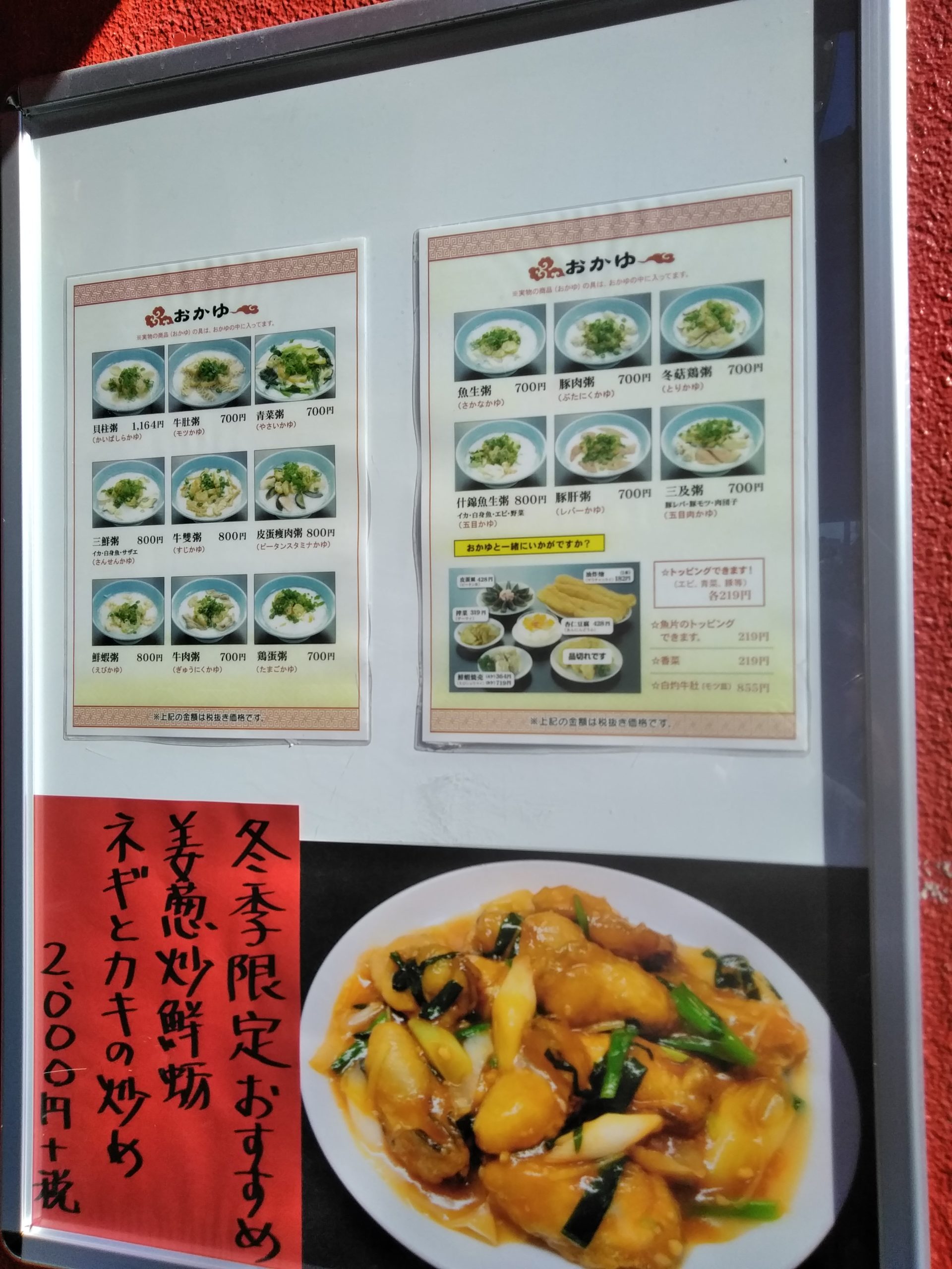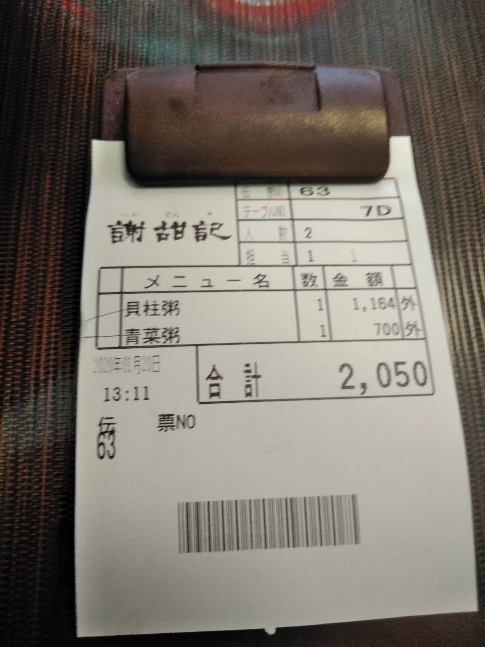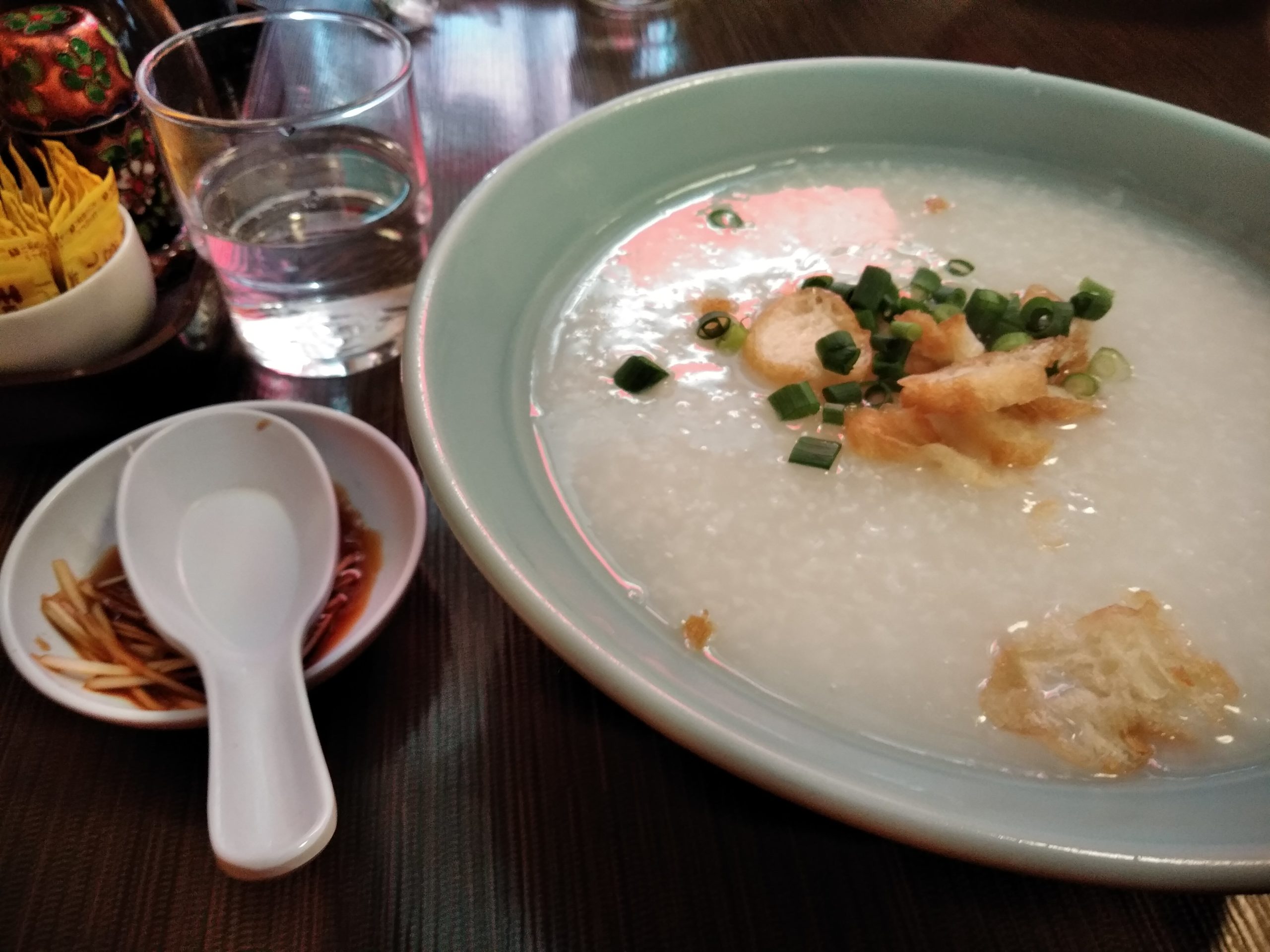 当然おすすめメニューは?お粥なのですが、15種類もあります。一番人気は、シンプルな青菜粥(やさいかゆ)¥700のようです。後はそれぞれ好みがあると思いますが、一番高い?貝柱粥 \1164をそれぞれ注文しました。