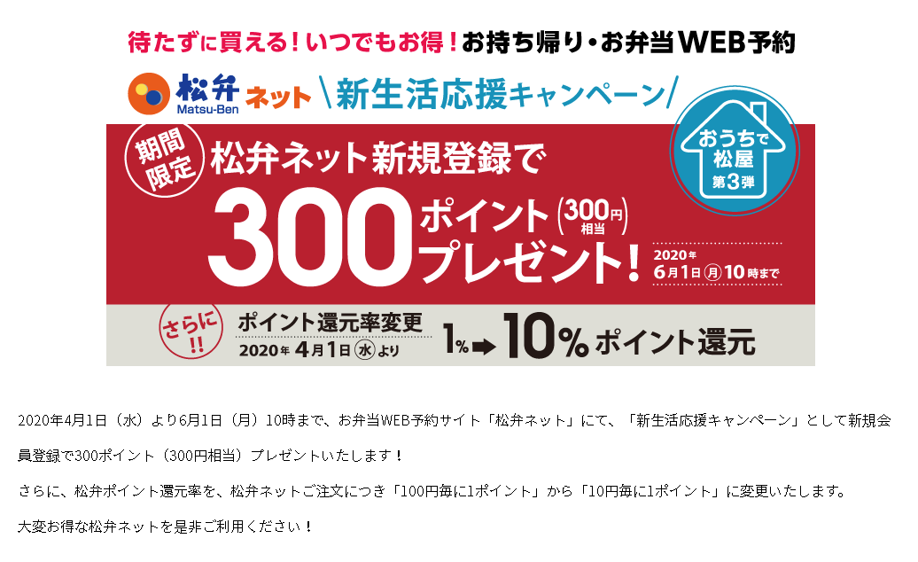 『松のや』(松屋も同様)では、もうひとつのお得があります。それは、松弁ネットへの新規登録で300ポイント(300円)相当が、貰えるというものです。また、ポイント還元が10倍となるようです。6月1日までの期間限定ですが、登録していない方は是非登録した方が良いと思います。