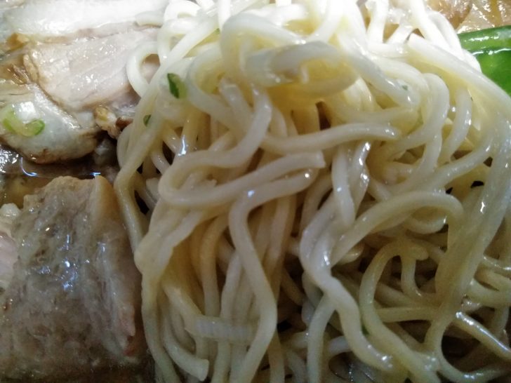 麺は細目のストレート麺です。若干柔らかめですが、スープとの相性も良くて、とっても美味しいです。