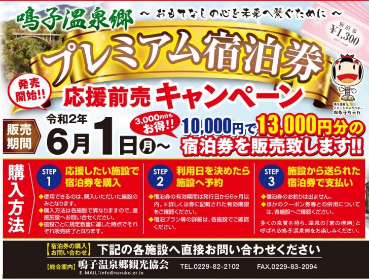 鳴子温泉郷は、これまで永きにわたり、多くの皆様をおもてなしさせていただき、癒しを感じていただきました。しかしながら現在、新型コロナウイルス感染症拡大防止のための営業や外出の自粛により、宿泊施設が大きな影響を受けています。鳴子温泉郷のおもてなしの心を未来へつなぐため、このたび、3割増し宿泊券「鳴子温泉郷プレミアム宿泊券」が販売されます(実施主体:鳴子温泉郷観光協会)お得な3割増し宿泊券の購入については鳴子温泉郷観光協会に確認してください。