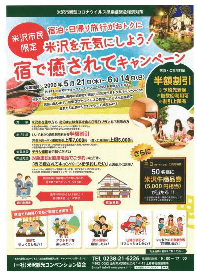米沢市民限定、宿で癒されてキャンペーン宿泊半額補助