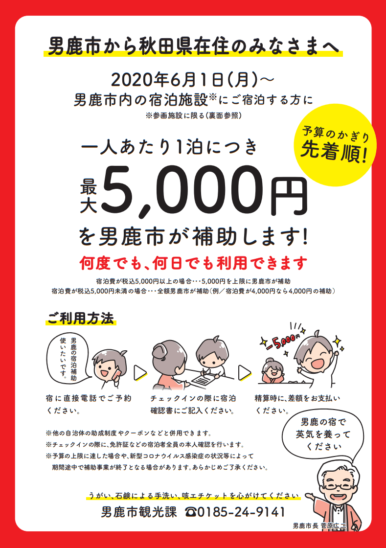 男鹿市では、新型コロナウイルス感染症に係る経済対策の一環として、秋田県民(秋田県在住者)を対象に宿泊助成を実施いたします。2021年2月末まで何度でも利用できますが、予算に達し次第終了します。秋田県が販売するプレミアム付き宿泊券との併用も可能です。
