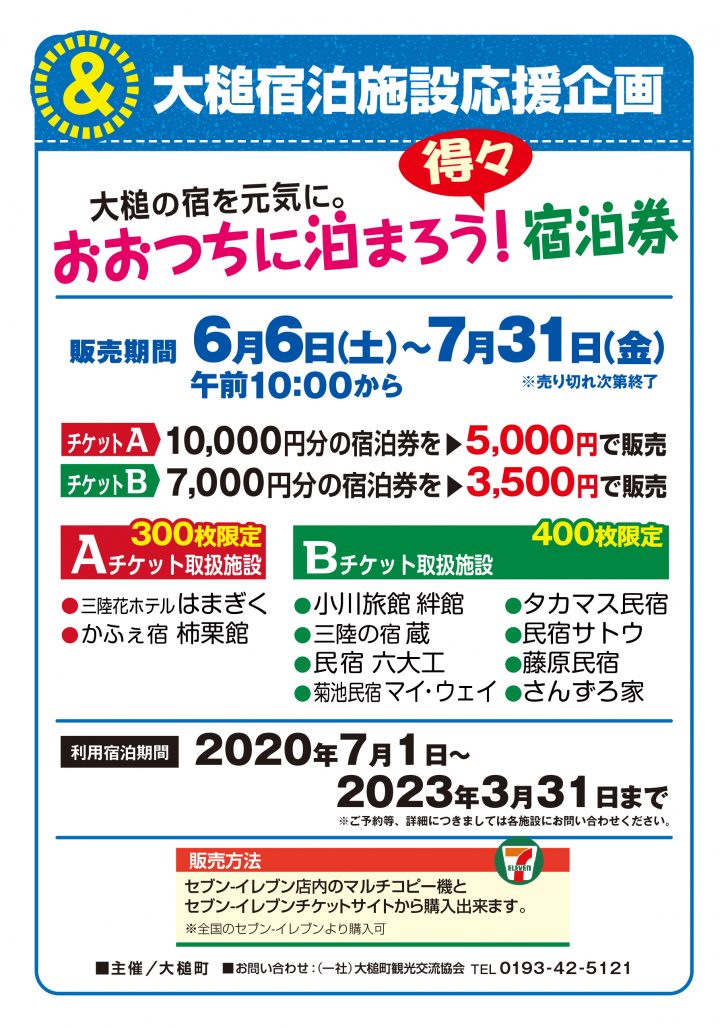 岩手県大槌町は、新型コロナウイルスの影響で打撃を受けた宿泊施設を支援するため、プレミアム付き宿泊券「おおつちに泊まろう宿泊券」を全国のセブンイレブンに設置の端末およびインターネットで販売します。プレミアム率は100%、販売期間は2020年6月1日〜7月31日、宿泊対象期間は2020年7月1日〜2023年3月31日で、合計600枚に達し次第、販売を終了します。大好評の「おおつちに泊まろう!宿泊券」をご要望にお応えして第2弾増刷します。 大槌宿泊施設応援企画として、大槌町内の宿泊施設にお得に泊まれる宿泊券です。