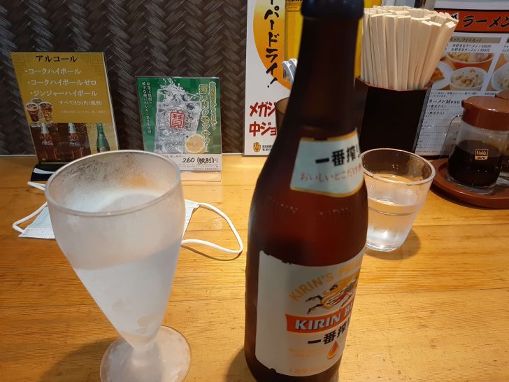 飲み物は生ビールか瓶ビール(中瓶)を選べます。私は、瓶ビールを選択しました。早速、一番搾り瓶ビール(中瓶)とキンキンに冷えたグラスが提供されました。