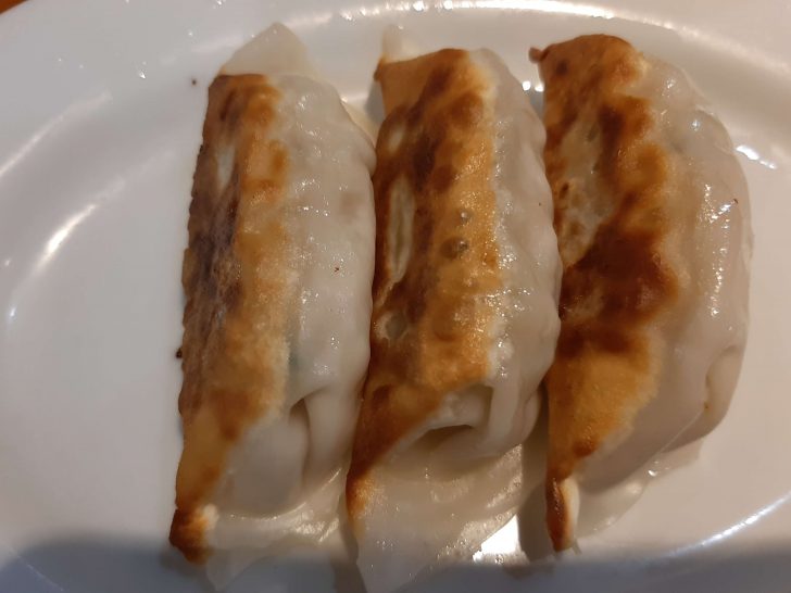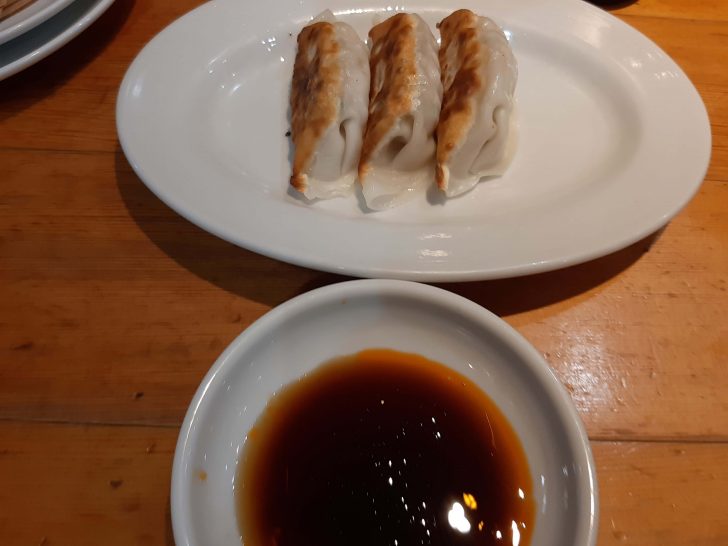二品目は餃子3個が提供されました。焼きたての餃子は、にんにくは入ってないですが、肉と野菜と肉汁たっぷりでとっても美味しかったですね。やはりビールのおつまみには餃子は最高ですね。