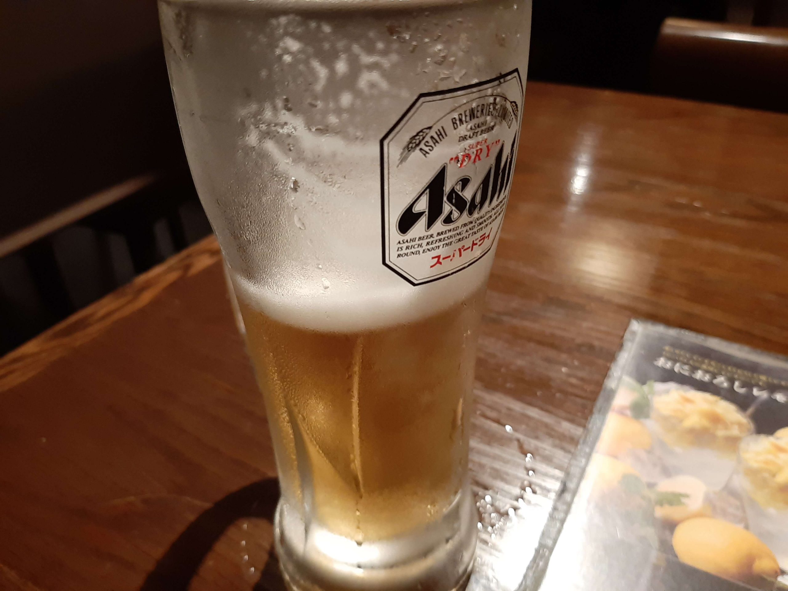 まずは、最初は生ビール(中ジョッキ)を注文しました。銘柄はアサヒスーパードライでした。生ビールは194円(税別)です。キンキンに冷えた生ビールはとっても美味しかったです。