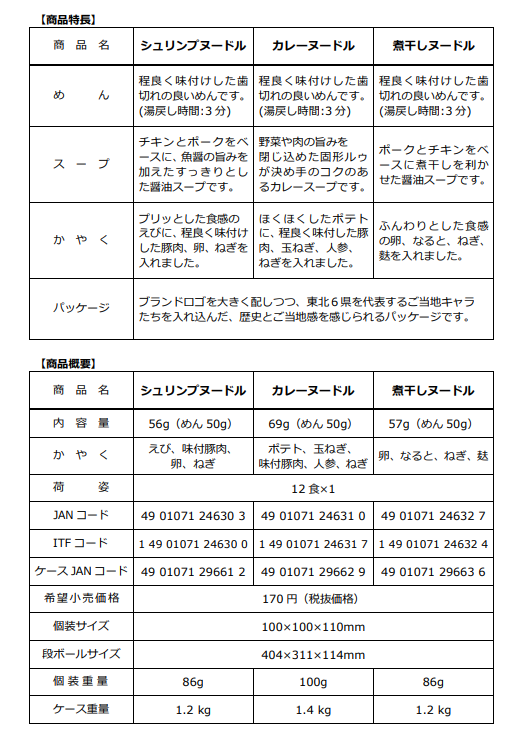 東北で愛され続けるロングセラーブランドで、パッケージに東北6県のご当地キャラが登場しています。程良く味付けした歯切れの良いめんです。ポークとチキンをベースに煮干しを利かせた醤油スープです。ふんわりとした食感の卵、なると、ねぎ、麩を加えて仕上げました。