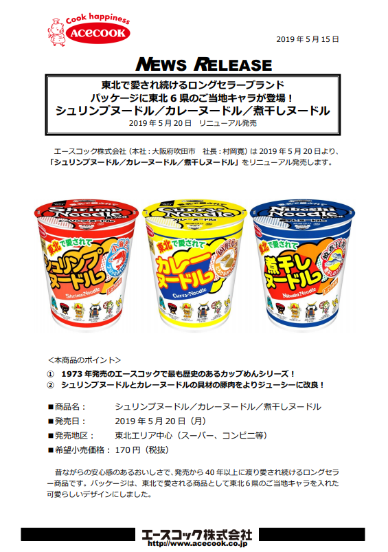 私も知らなかったのですが、シュリンプヌードル/カレーヌードル/煮干しヌードルが、2019年5月にリニューアルされて東北6県限定のカップ麺として発売されたようです。元々発売されたのは、なんと1973年とのことなので、今から47年前になります。47年前といえば、私がまだ中学生の時ですね。確かに、その昔シュリンプヌードルとカレーヌードルは食べた記憶があります。煮干しヌードルは、その時にはなかったと思いますが、良く調べてみたら、煮干しヌードルは、新しく2017年に発売されたようです。