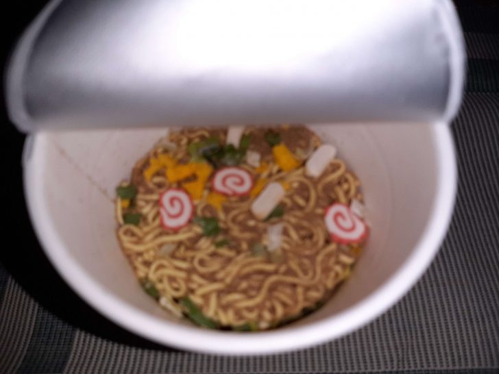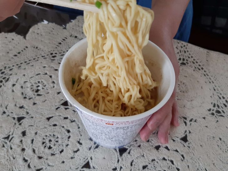 お湯を入れると煮干しの香りが凄いんです。青森が本場の煮干し中華には、具として麩が載っているのですが、それと同様にこの煮干しヌードルにも麩が入っていました。