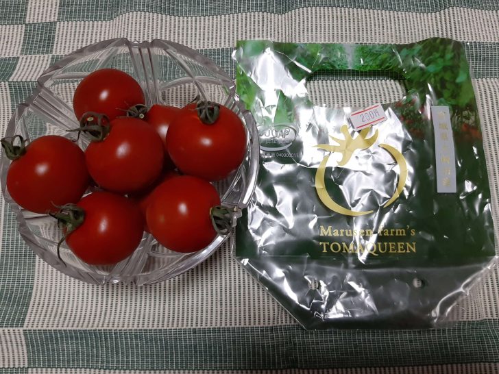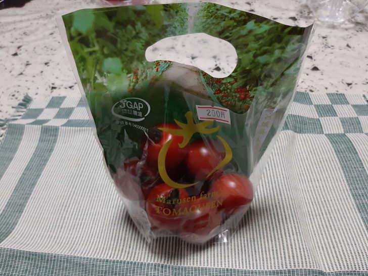 今回は、「わくわく広場イオンタウン仙台泉大沢店」に行ったら、たまたまマルセンファームの中玉トマト「トマクイーン」が売っていました。今年の「トマクイーン」の販売時期も終盤でしたが、以外にも値段も1袋200円と安かったです。