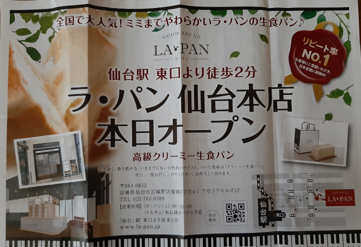 東京・神奈川・大阪・京都・福岡と次々に出店をしている高級生食パンのお店LA・PANが8/1に仙台にオープンしました。早速行ってきたので紹介したいと思います。