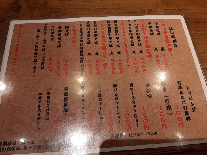 今回は娘と軽く飲んで、締めで食べました。『うまい』と叫んでしまうほど美味しかったです。しかし、飲んでいたから美味しかったのでは?と思う部分もあるので、再度訪問してしらふで食べてみたいと思います。また、期間限定麺も色々あるようなので、時々行きたいお店ですね。