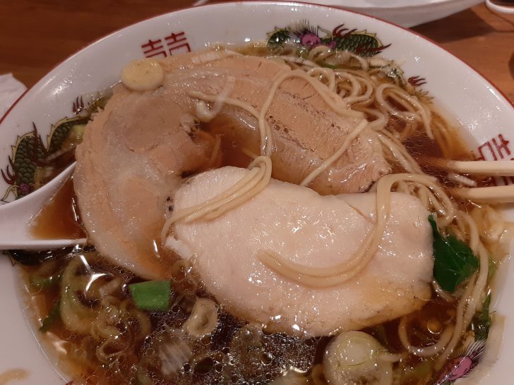 まずはスープですが、鶏出汁(しゃも?)を感じるしっかりとしたスープですね。醤油は濃いめですが、バランスが良く美味しいです。また麺がストレートの細麺で、パッツン感があります。チャーシューは、鶏むね肉チャーシューと豚バラチャーシューの2種類が載っています。鶏チャーシューはしっとりと柔らかで、周りの粒胡椒が効いていています。もうひとつの豚バラチャーシューは、しっかりとしたお肉感があります。これも美味しいですね。